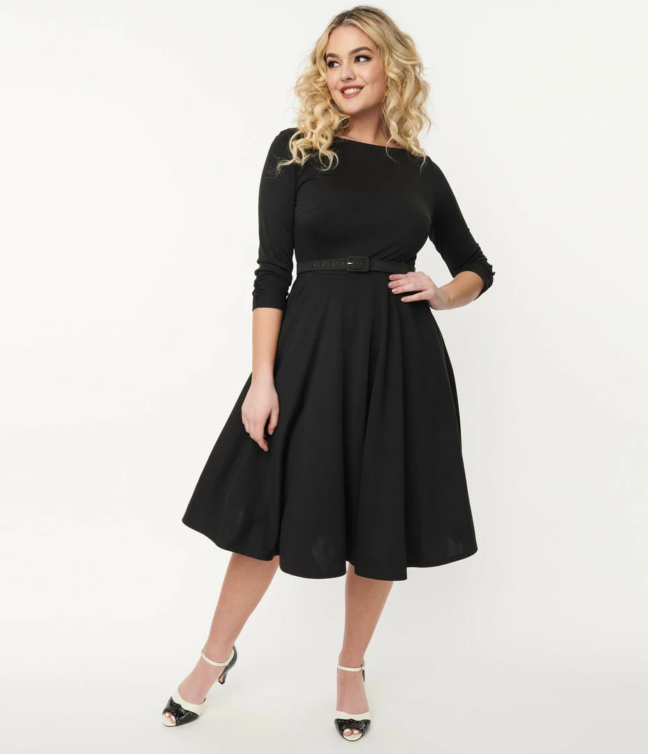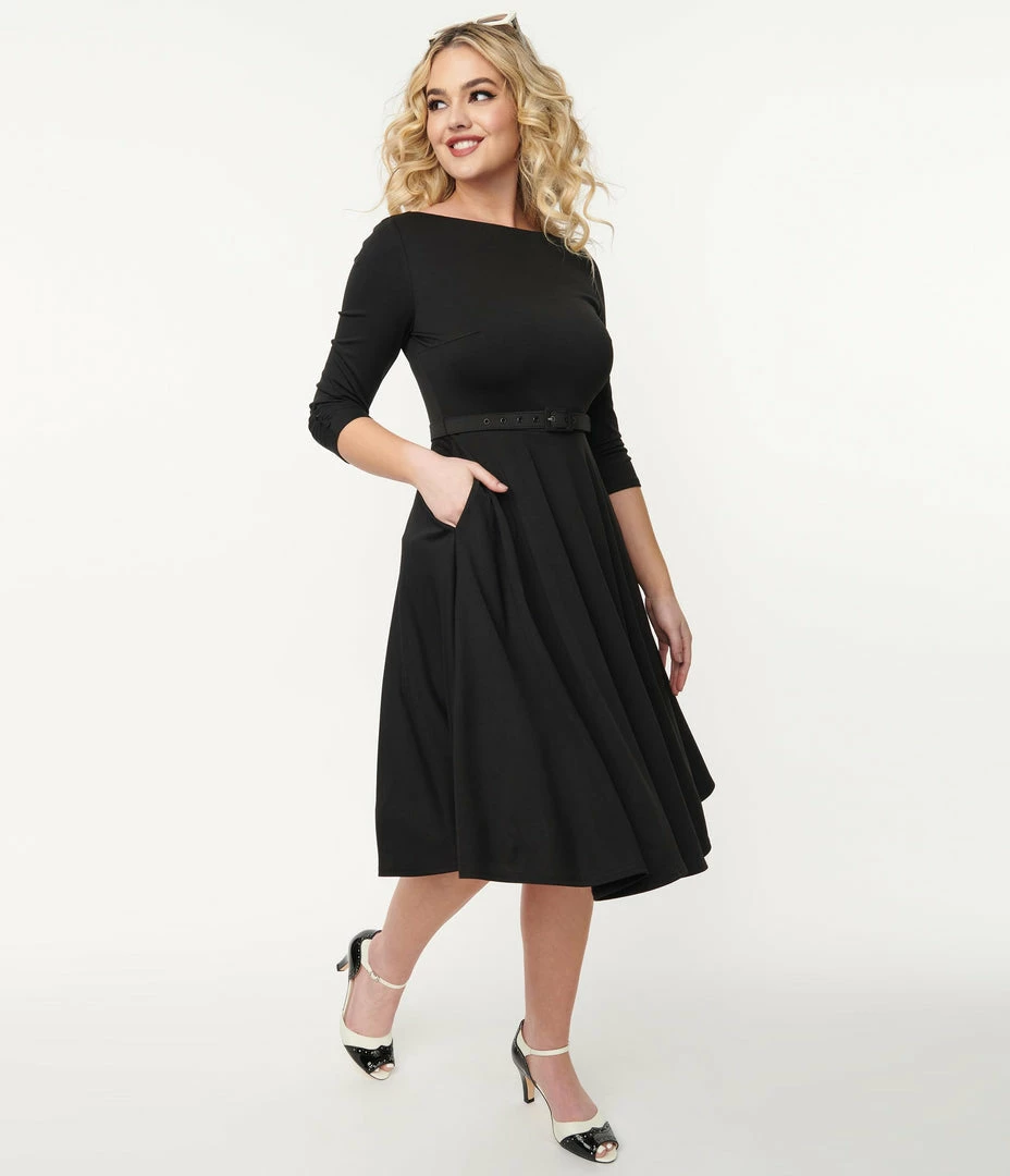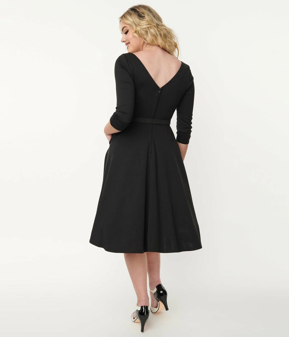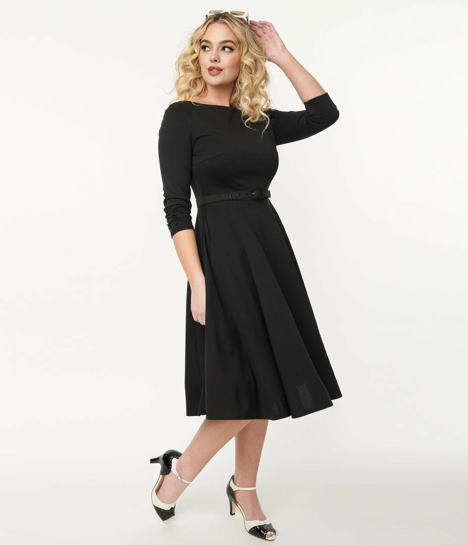 Devon’s got a relentless drive, gals! A fantastically faithful mid century silhouette from Unique Vintage, the Devon Dress is a sultry swing full of unstoppable beauty. Cast in a black knit blend for an enchanting and eye-catching embellishment to your figure as a darted bodice and dramatic bateau neckline drops into a sultry V in the back. The sleek three-quarter length sleeves allow for cheeky pin-up posing as the dynamic swing skirt drops to your knees with ample room for a petticoat pop. Outfitted with hidden side pockets, a back zipper, and a charming belt to cinch in your form, drive it like you stole it!