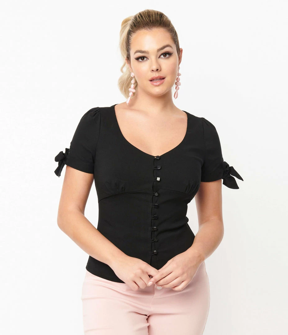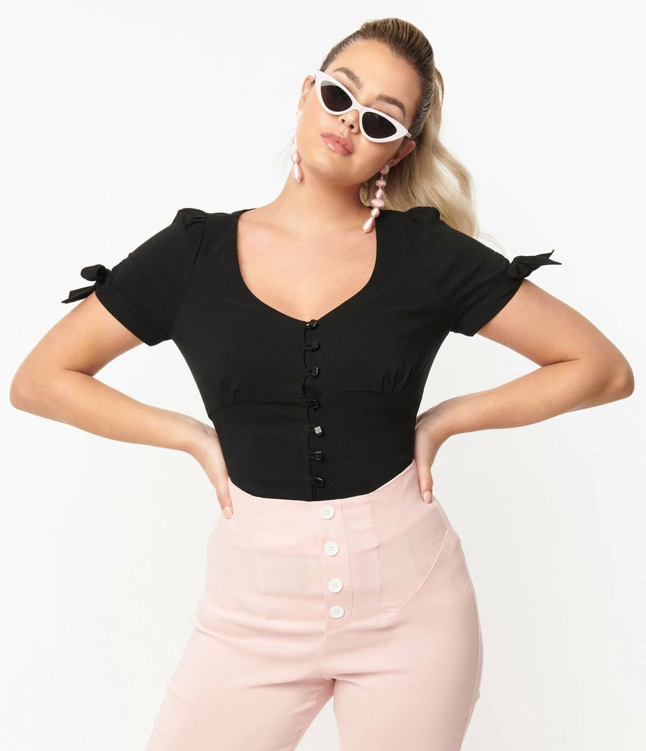 Set your desire to smoldering, dames! Place yourself in demand with a ravishing separate from Unique Vintage, crafted in an eye-catching black. The Noreen Top is structured with a button up front that leads to a sultry sweetheart neckline and framed by daring short sleeves that boast a self tie keyhole cuff for added retro charm. The empire seamed waist tops a tapered silhouette that drops into a straight hemline that tucks easily into your favorite skinnies!