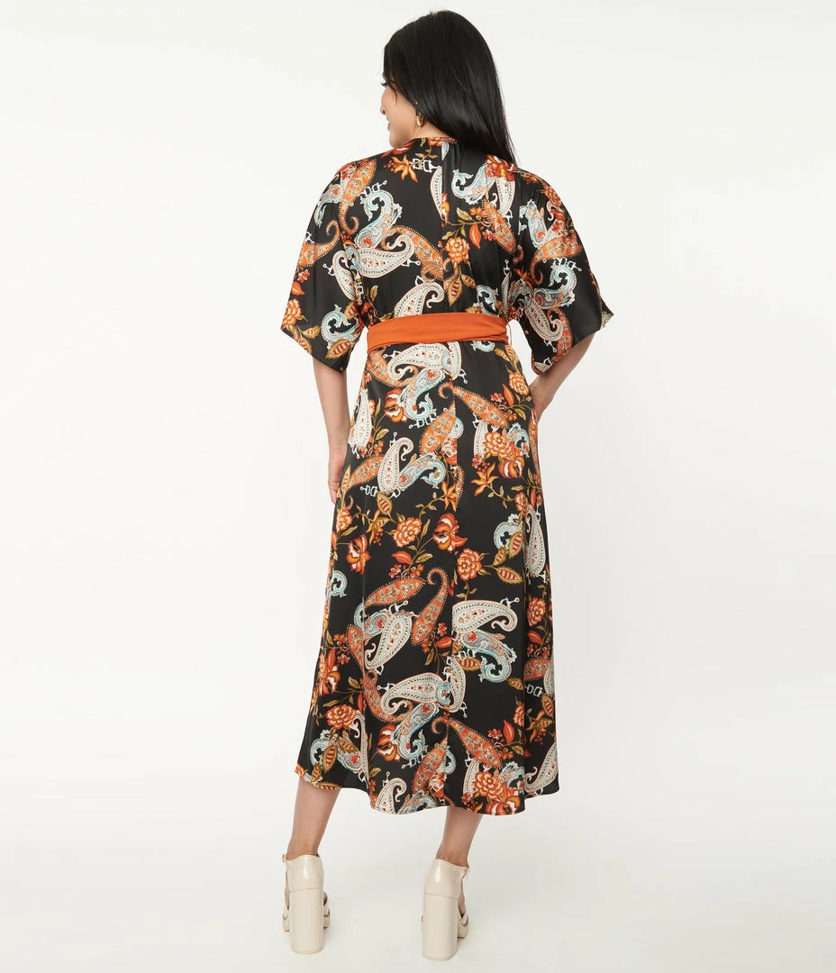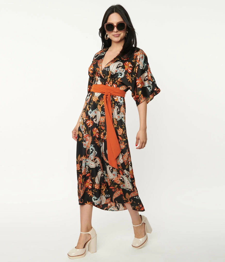 Flash Sale 🔥 Clothing Unique Vintage Black & Rust Paisley Wrap Midi 👗 Dress ⭐
