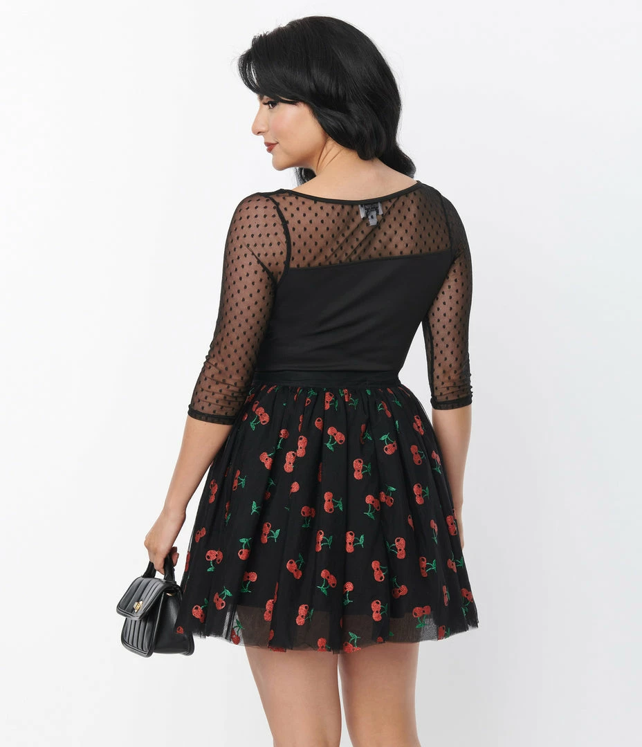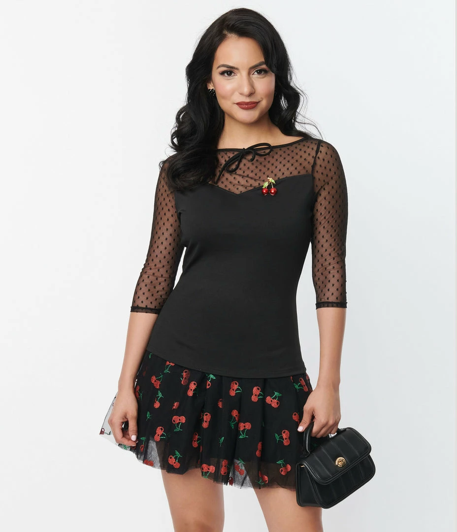 This elegant 1950s style top is crafted in a black knit and topped by black mesh, dancing with black Swiss dots throughout. Complete with a red cherry brooch and three-quarter length mesh sleeves.