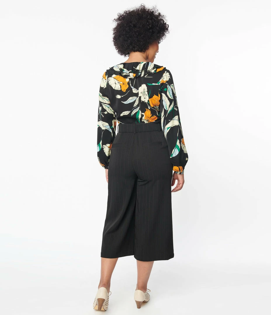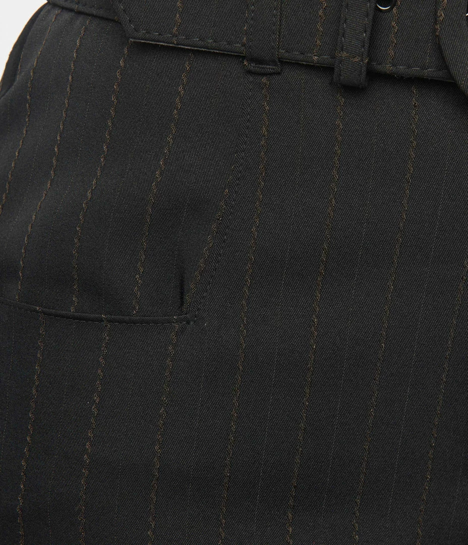 The Ginger Capri Pants are a fabulous black piece, crafted in a lightweight woven fabric boasting a brown contrast twill pinstripe design. The high waisted silhouette is accented with wide leg capris to create a retro silhouette that flatters. Complete with front zipper, side pockets, and matching belt.