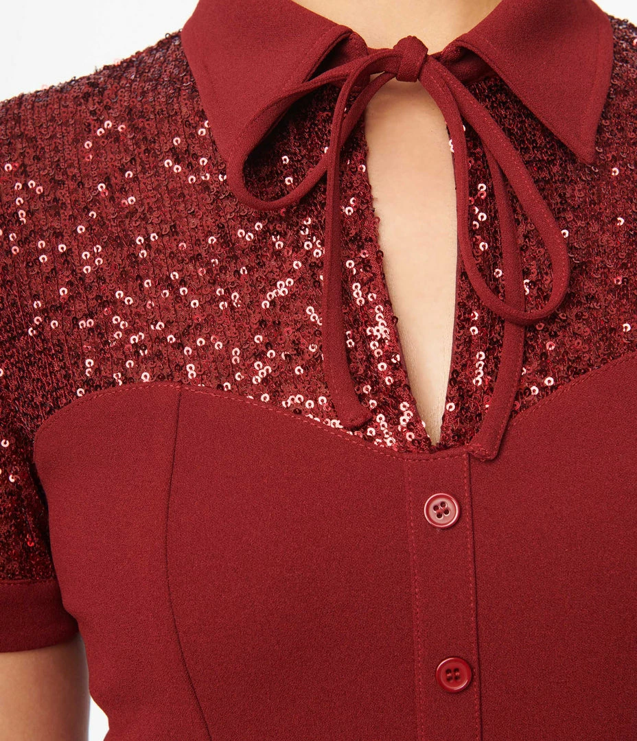 This divine flare dress is crafted in a woven burgundy red fabric with a dash of stretch and features a burgundy red sequin neckline. Outfitted with a self tie keyhole, a faux button up front, a mid back zipper, and side pockets!