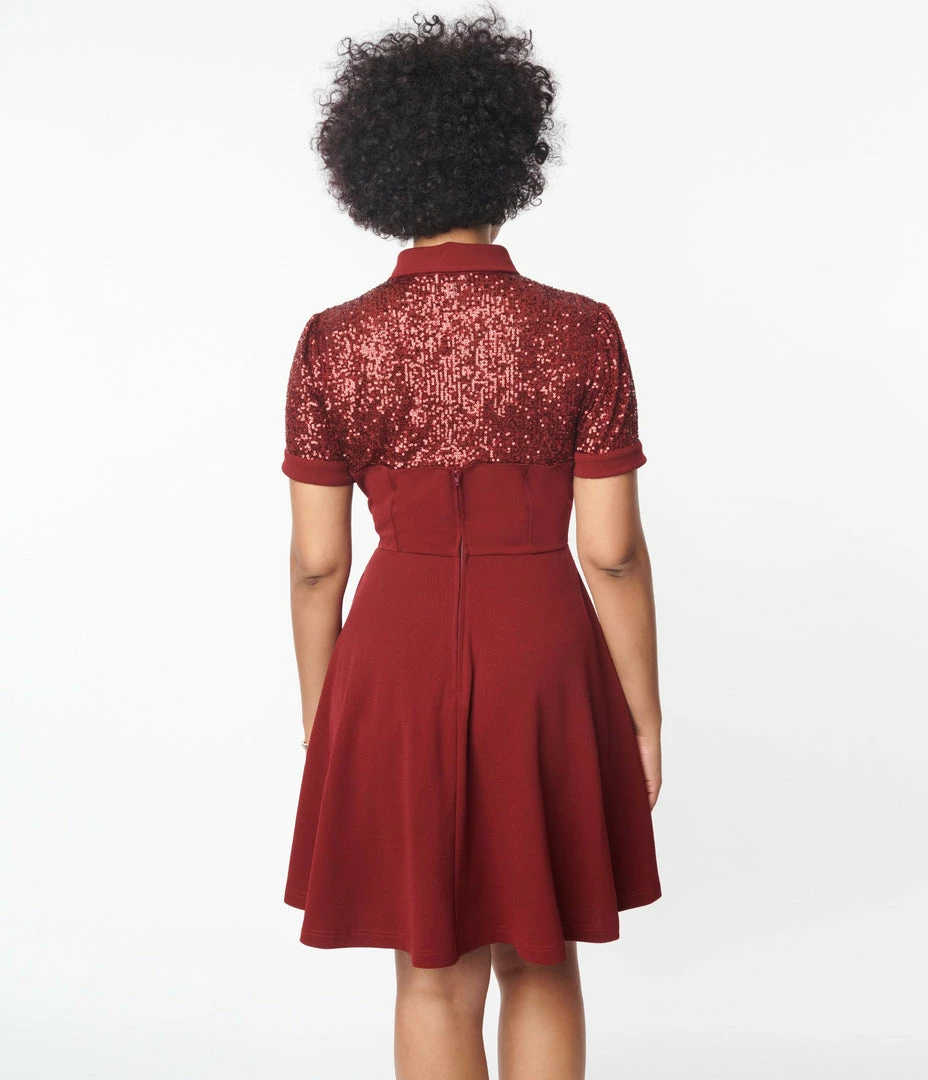 Best Pirce 👍 Clothing Unique Vintage Burgundy Sequin Lace Fit & Flare 👗 Dress ✔️