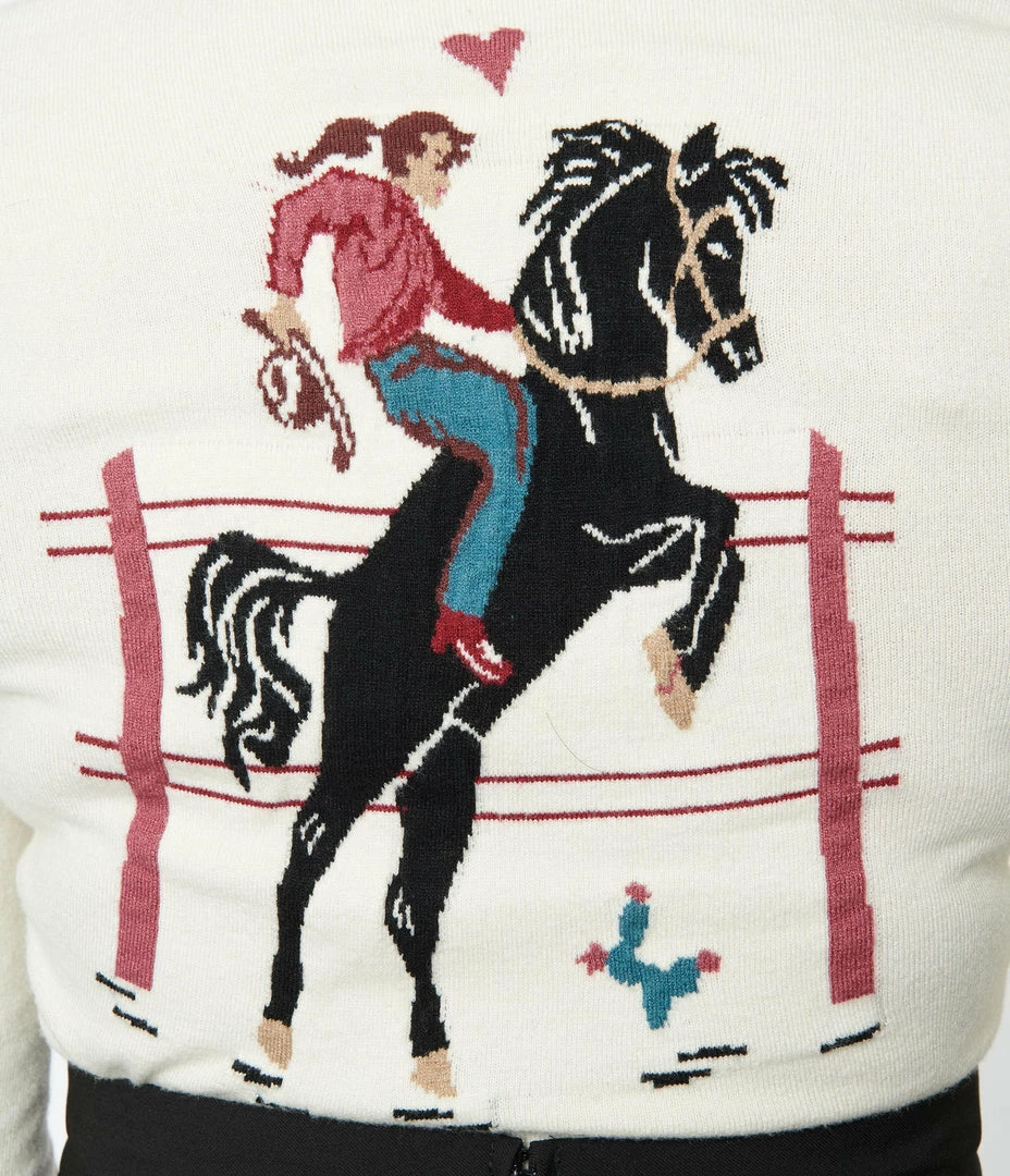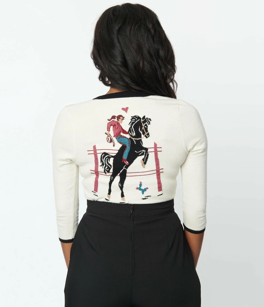 This adorably sweet cardigan is crafted in a cream knit with black accents and features a cowgirl and her black horse on the back. Outfitted with a button up front, three-quarter length sleeves, and a darling belt.