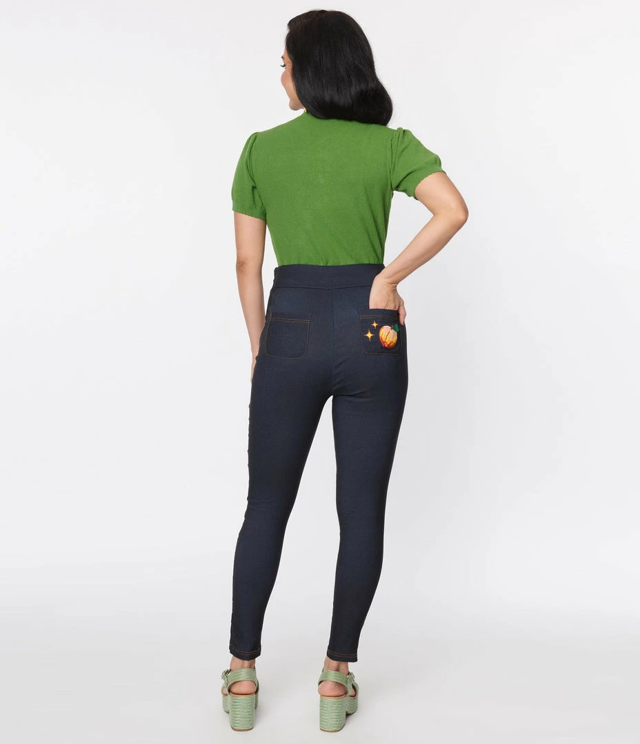 The Rizzo Pants are crafted in a denim blue stretch bengaline while a sweet embroidered peach patch sits on the back pocket. Complete with a side zipper.