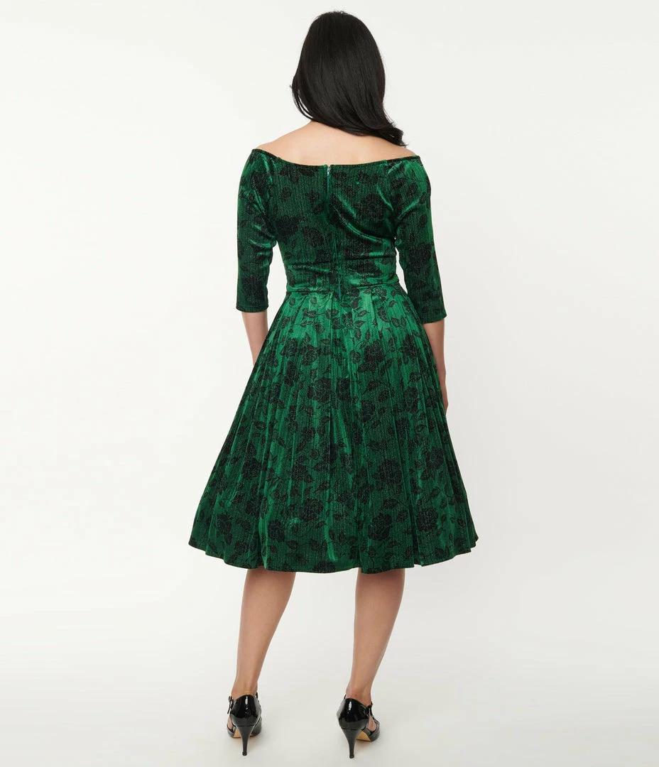 Wholesale 🎉 Clothing Unique Vintage Green & Black Rose Velvet Marceline Swing 👗 Dress 😍