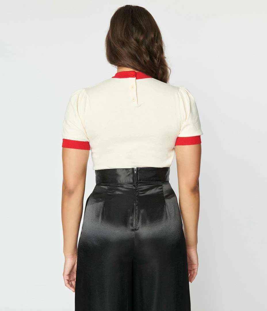 This sumptuous sweater is crafted in a charming ivory knit that boasts a sweet Scottie dog. The Farrow Top features a contrasting red crew neck and charming short sleeves while a button back allows for an easy pullover. Complete with a stay-in-place hem, grab this midcentury must for a stable companion!
