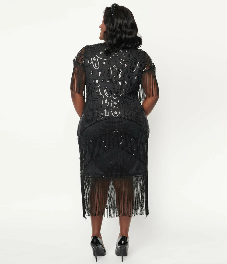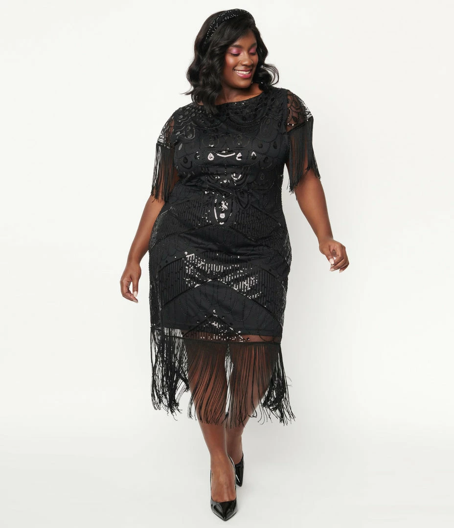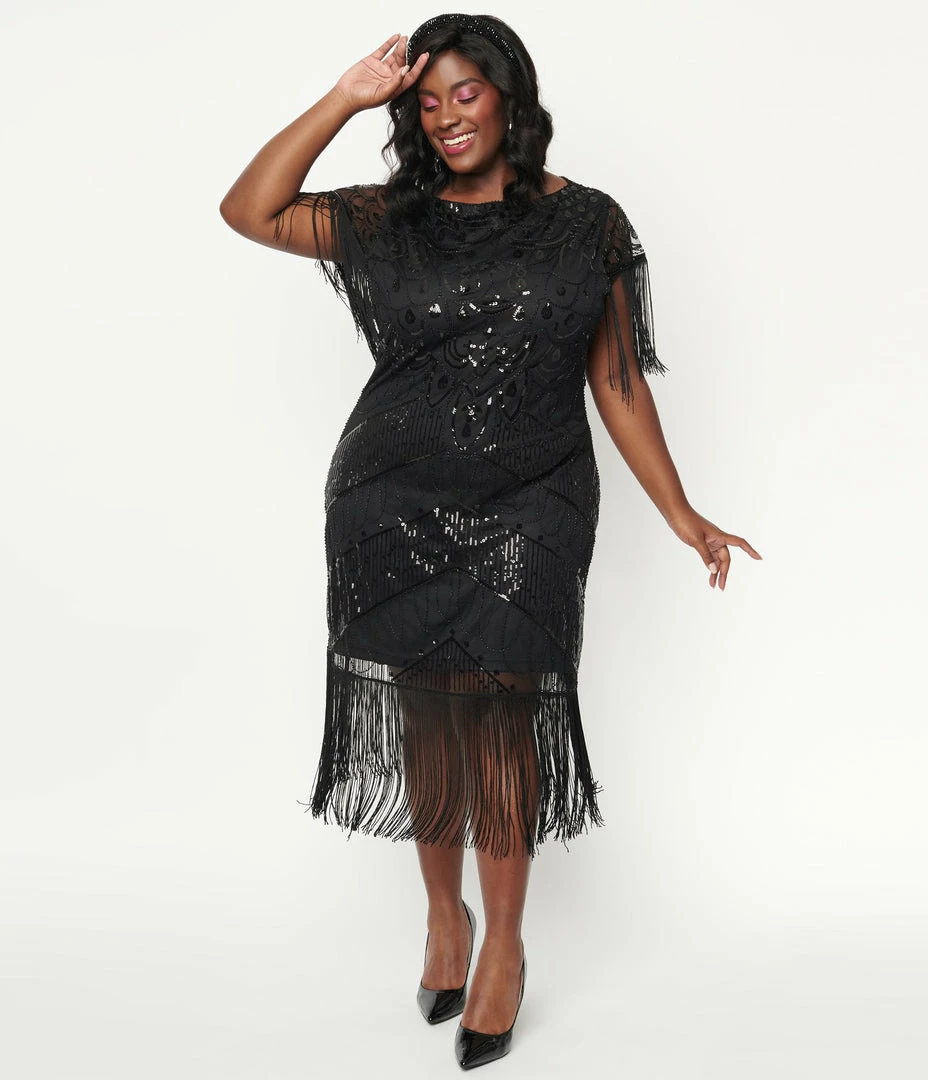 Sparkling, stylish and spectacular! This striking plus size cocktail dress from Unique Vintage shimmers with black sequins throughout a vintage flapper silhouette. The Laure Flapper exudes 1920s glamour with intricate beading and sequins throughout black mesh that overlays a stretchy knit black lining. The modest scoop neckline is framed by sweet cap sleeves that shimmy with black fringe. Gleaming from every angle, the fitted form drops to a straight hemline that sways with long black fringe. Jazz up your special occasion!