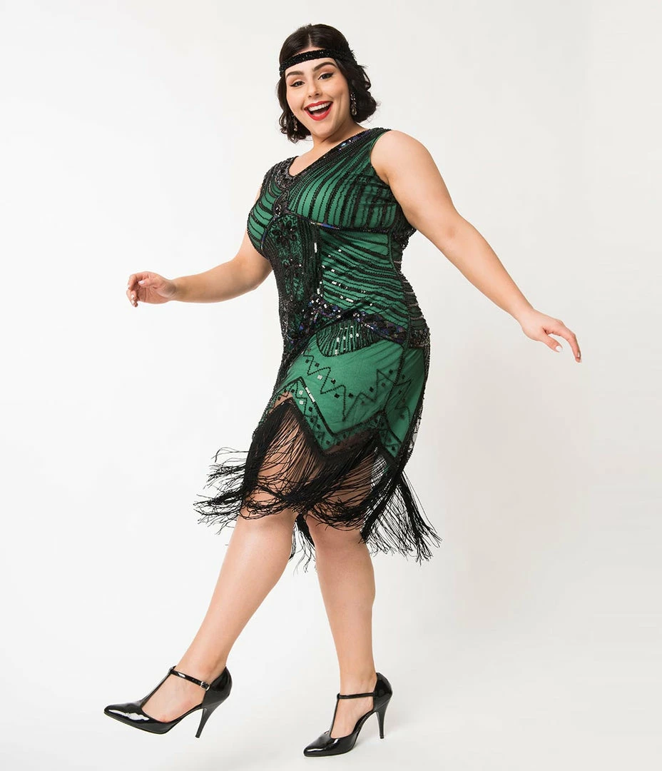 With a bit of shimmer and gleaming detail, the Veronique Flapper dress is fresh from Unique Vintage in gorgeous plus size 1920s design. Intricately deco beaded black mesh boasts black iridescent sequins and small black beads wrought in flourishing deco swirls and spirals, while emerald green knit lining creates a radiant effect. The sleeveless, v-neck design shows you off with a modest touch, while the curve hugging fit and jagged edge dripping with fringe will turn every head!