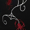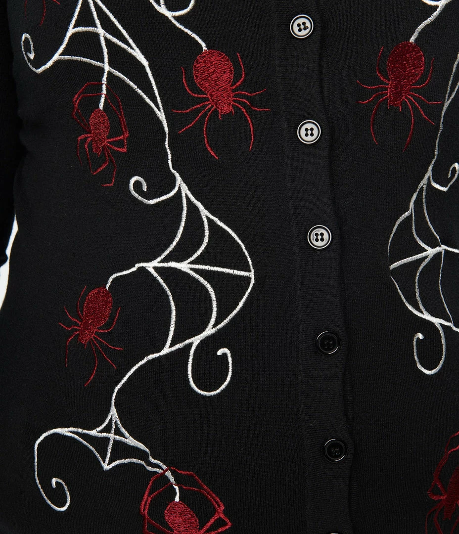 This deliciously soft black knit plus size cardigan features creepy red embroidered spiders crawling throughout the white spiderweb. Complete with a button up front and three-quarter length sleeves.