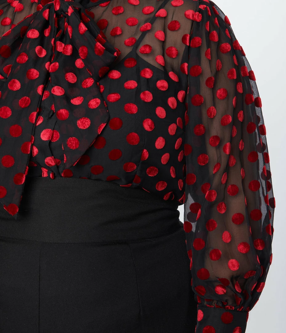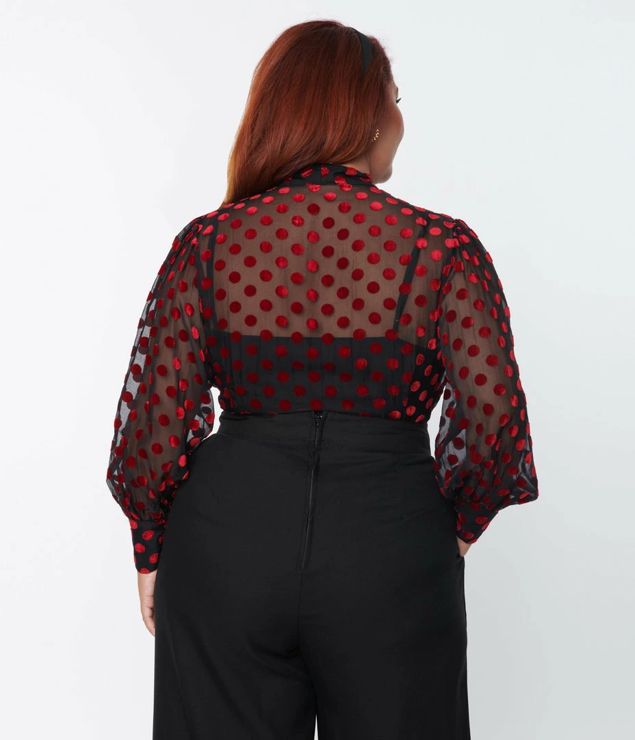Buy 🥰 Clothing Unique Vintage Plus Size Black & Red Dot Sheer Gwen Blouse 👍
