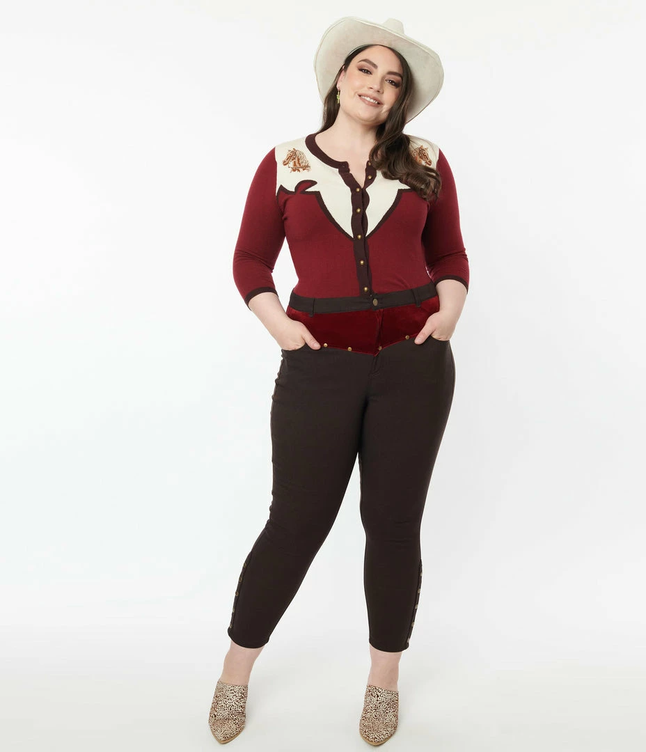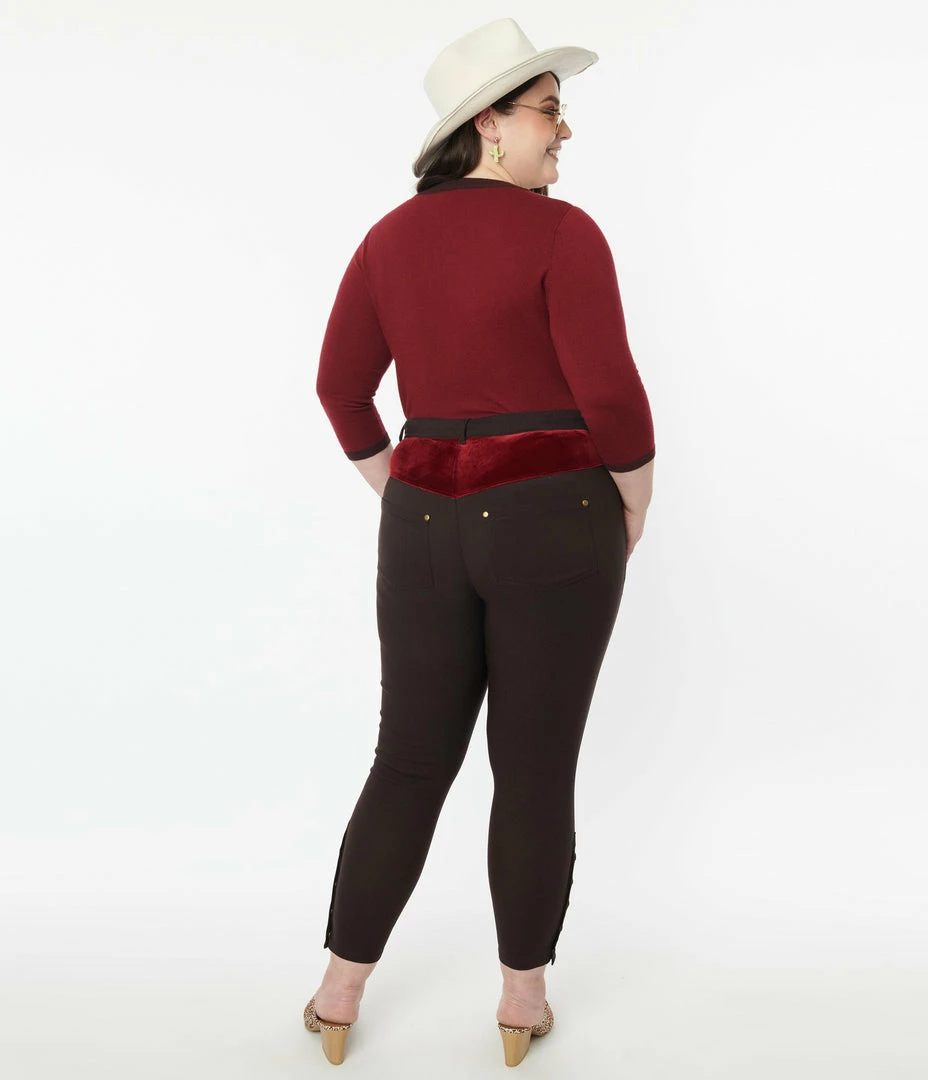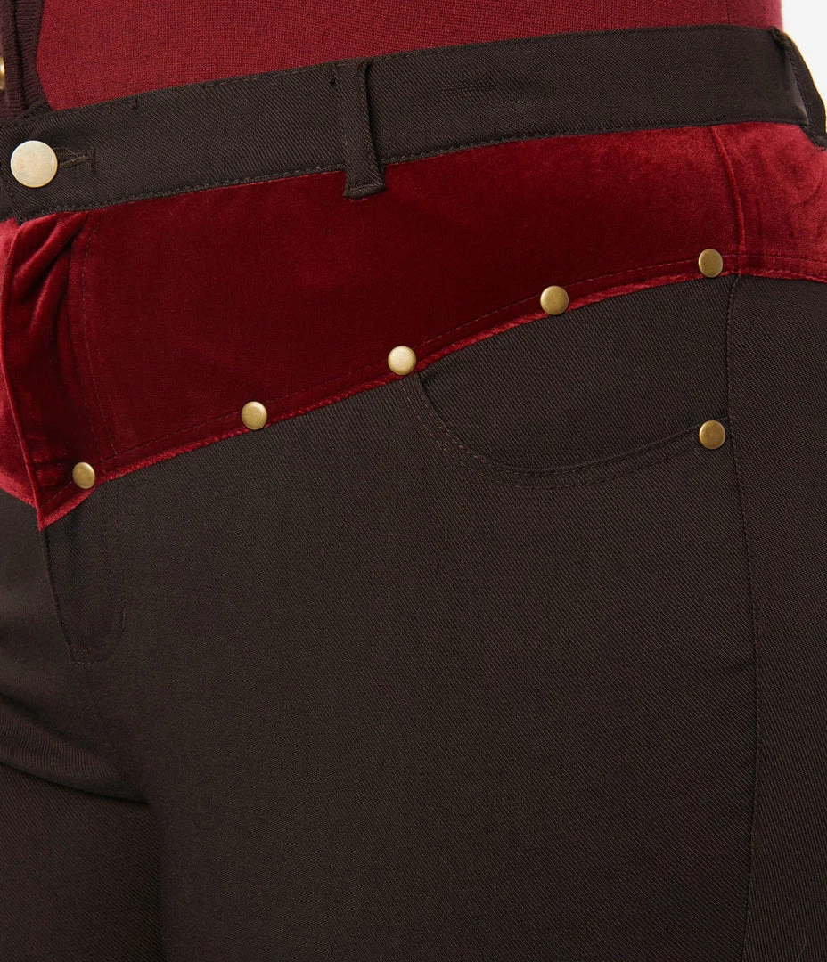 Crafted in dark brown stretch denim and boasting a fabulous plus size high waist accented with a burgundy velvet yoke. Secured with a front zipper and button, the cigarette legs drop to your ankles while side and back pockets lend modern function, embellished with studs throughout!
