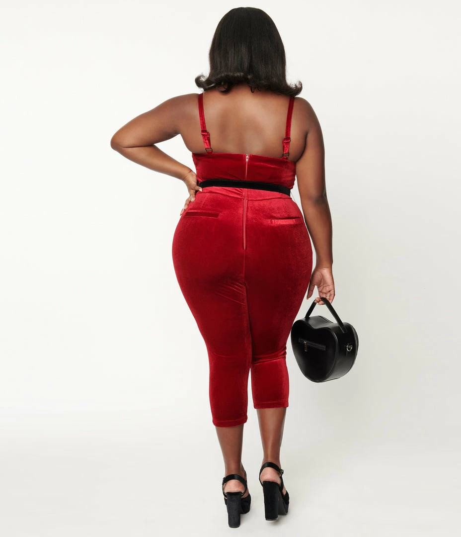 Best deal ๐ Clothing Unique Vintage Plus Size Burgundy Velvet Cropped Jumpsuit โจ