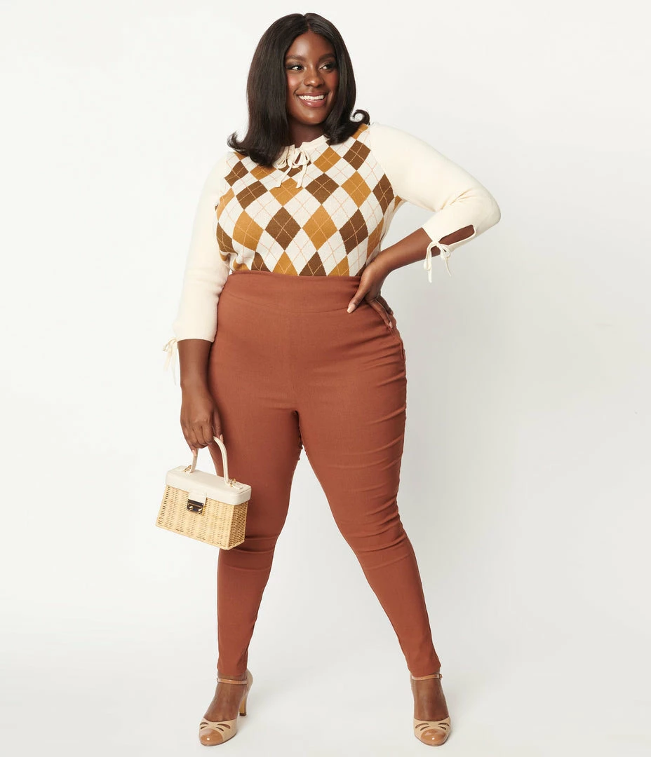 This sweet knit plus size sweater features a brown argyle pattern on the front of the solid cream silhouette. Complete with a self tie keyhole neckline and self tie keyhole cuffs.