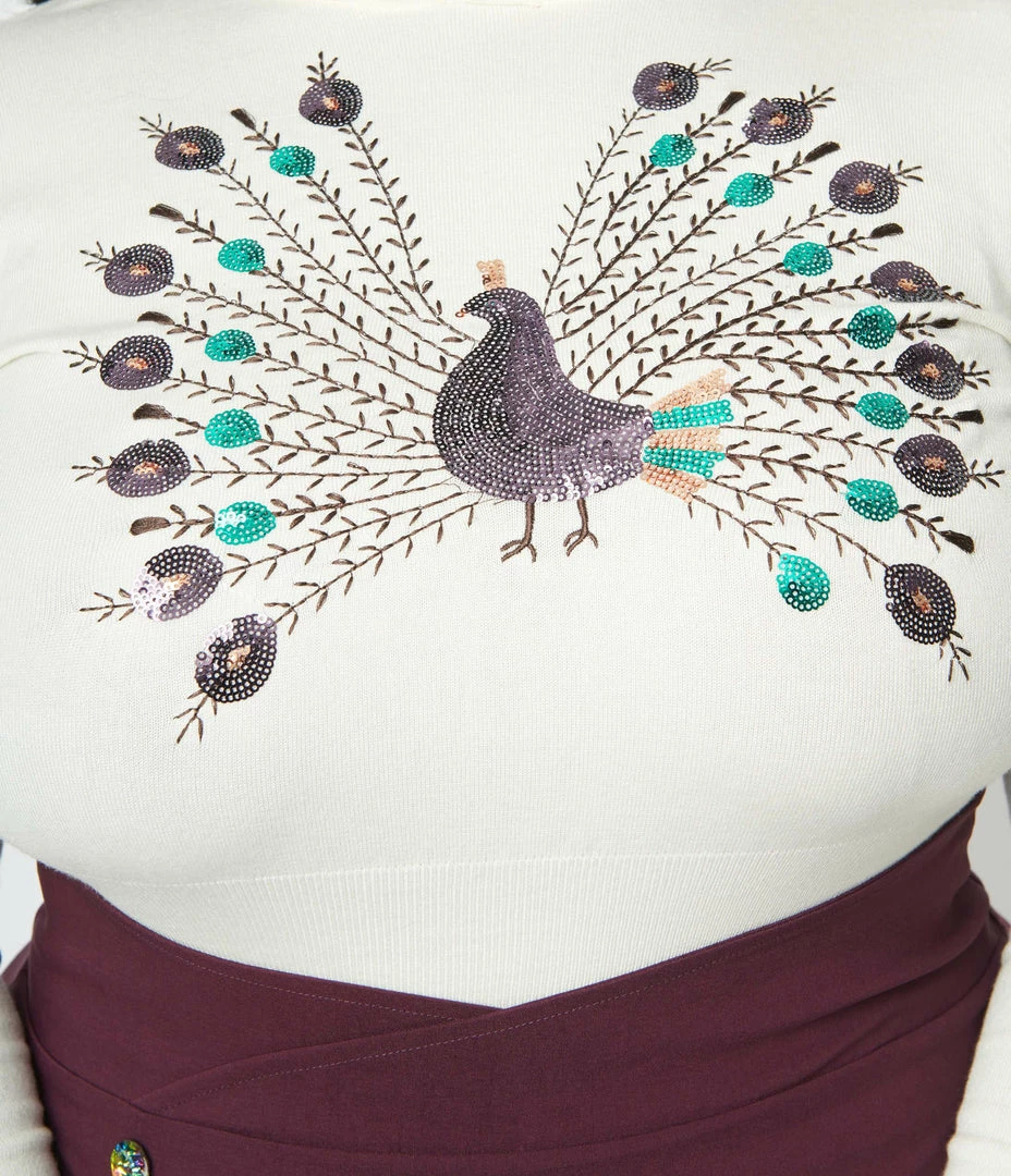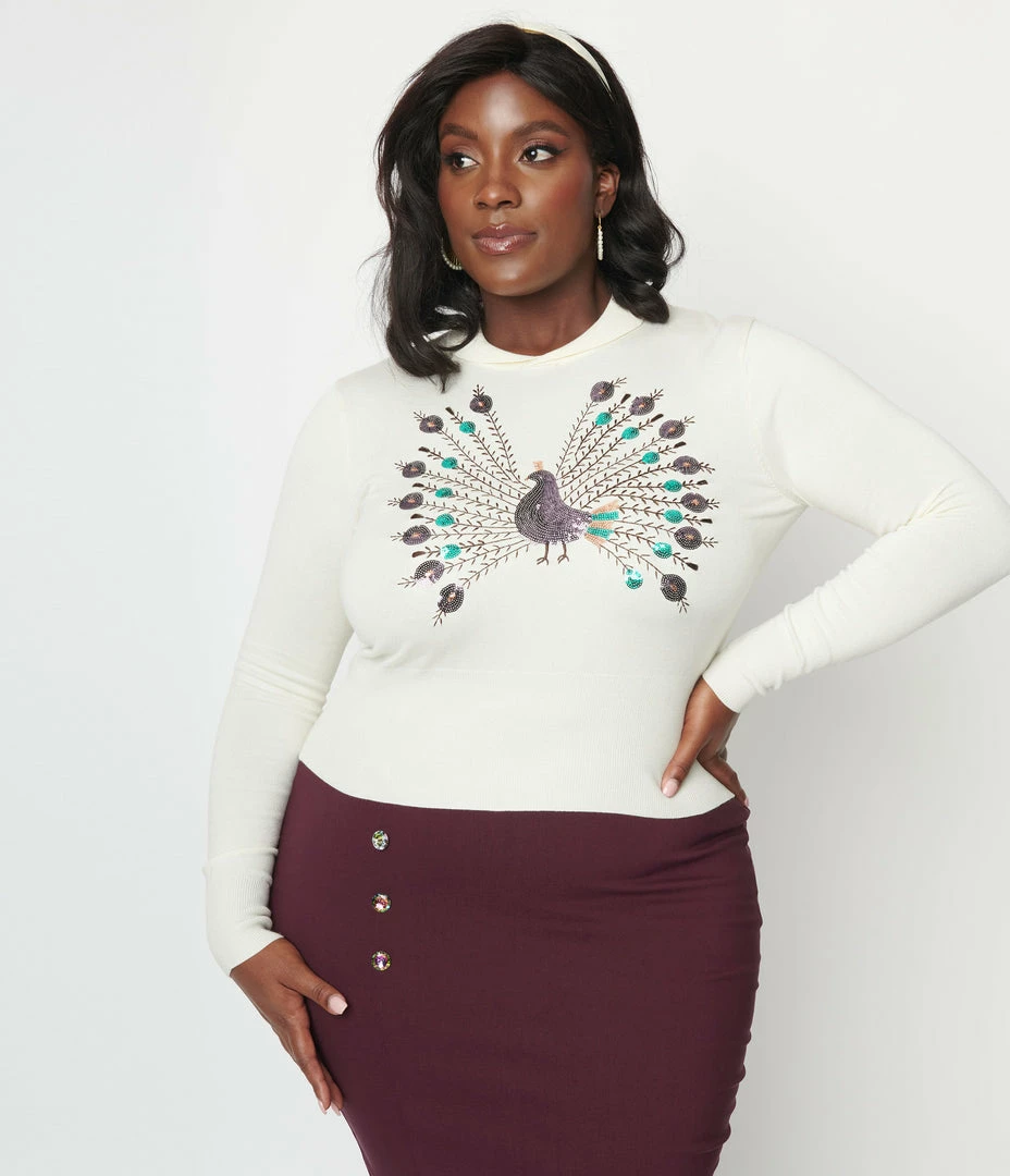 This soft plus size sweater is crafted in a soft cream knit fabric featuring sparkling sequin peacock on the front. Complete with a cropped hem, long sleeves, and ribbed cuffs.