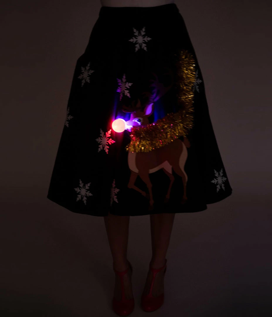 Itโs your holiday bestie, dames! The Soda Shop Skirt from Unique Vintage is an ally in the gift-giving spirit with itโs soft felt-like black fabric, cast in a fabulous 1950s swing skirt silhouette. An adorable appliquรฉ of Santa’s favorite reindeer dancing on the side with sparkling tinsel leash and a blinking red nose. The banded waist cinches in the back with hidden zipper for a secure fit while convenient side pockets allow you to bring reindeer treats! Whether itโs naughty or nice, youโre set for the next sleigh ride, dears!