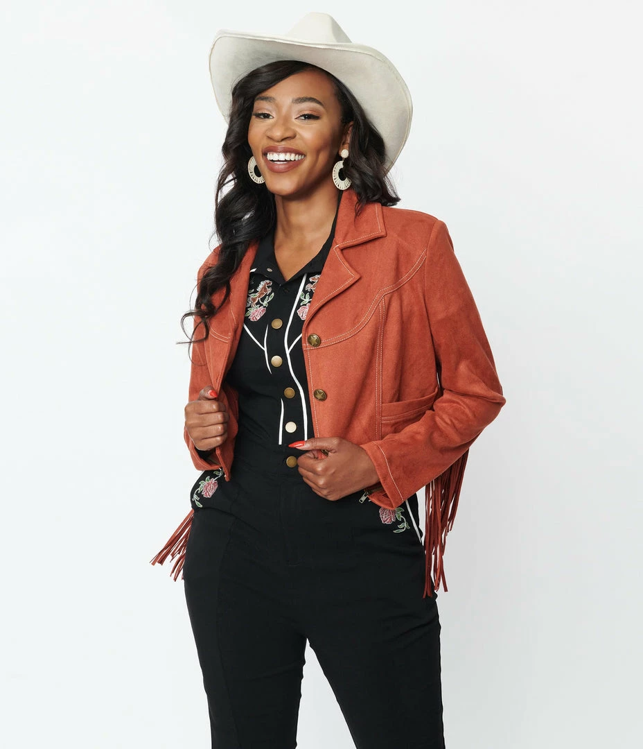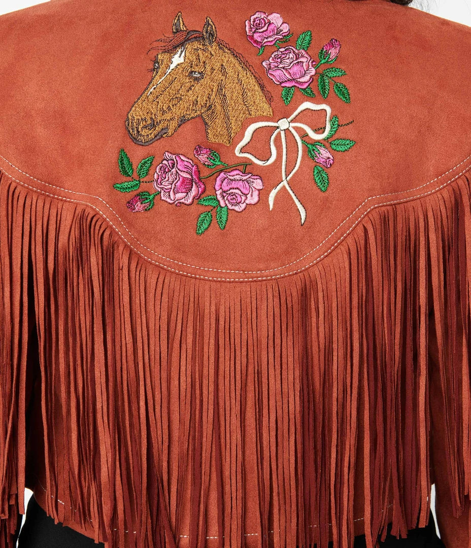 This delightful crop jacket is crafted in a soft rust red faux suede. The back fringed yoke features embroidered roses and a horse.