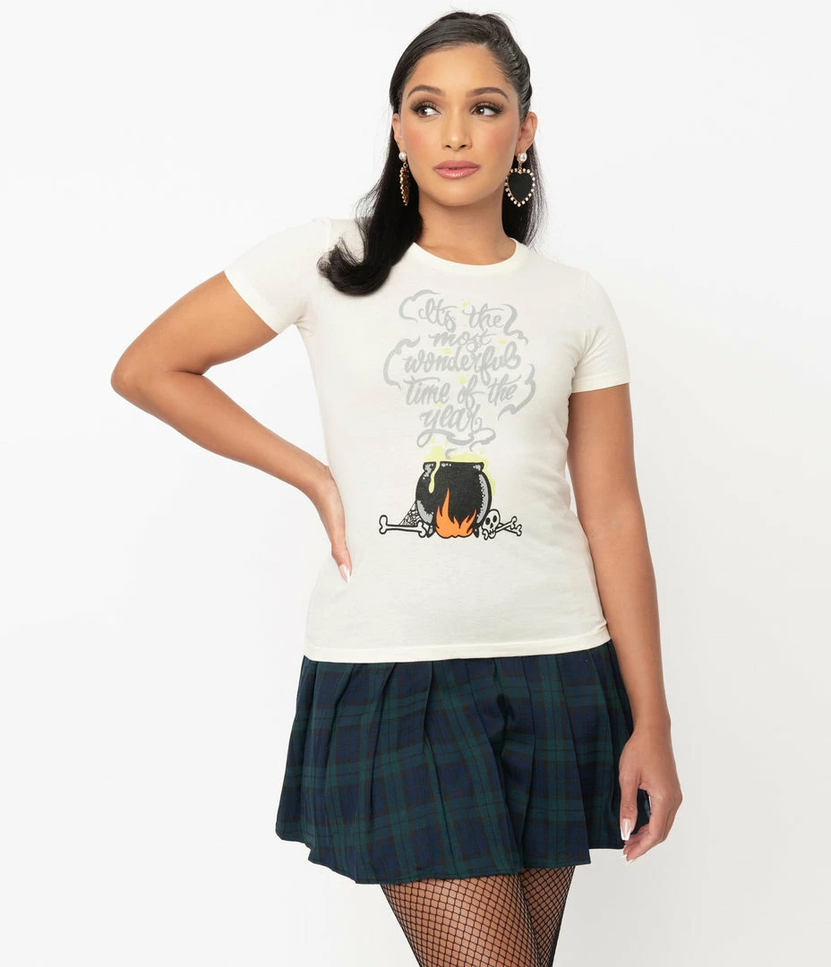 It’s the scariest season of all, dolls! A witchy women’s tee from Unique Vintage, this magical separate is cast in a soft and fitted ivory cotton knit, perfect for a little witchcraft. The bubbling cauldron reveals a wicked sense of humor with cursive smoke that reads, ‘It’s the most wonderful time of the year’. With a ribbed scoop neckline and short sleeves, a party is brewing!