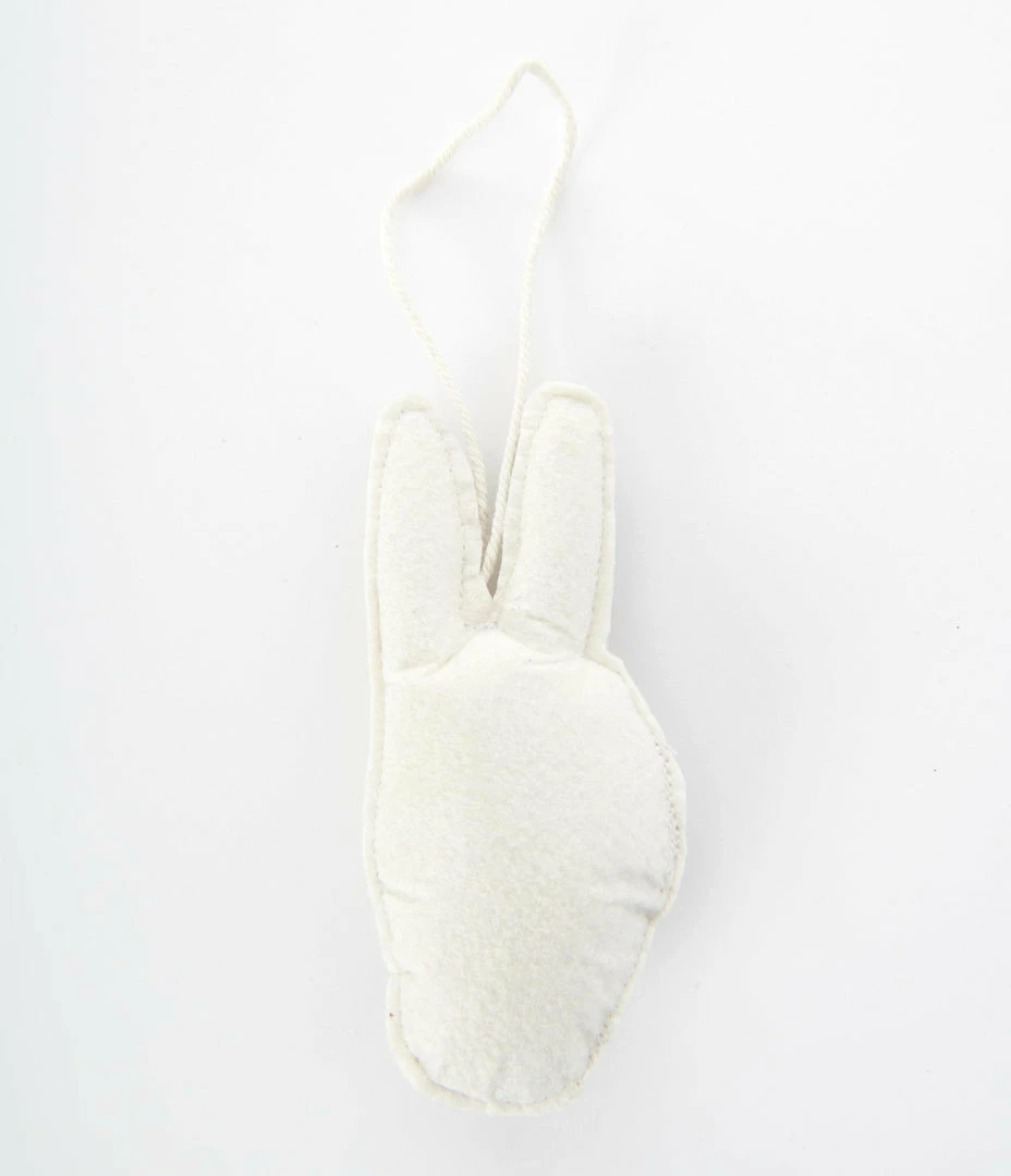 This adorable holiday ornament is crafted in felt in the shape of a hand giving a peace sign, and accented with glass beads, faux pearls, and rhinestones!