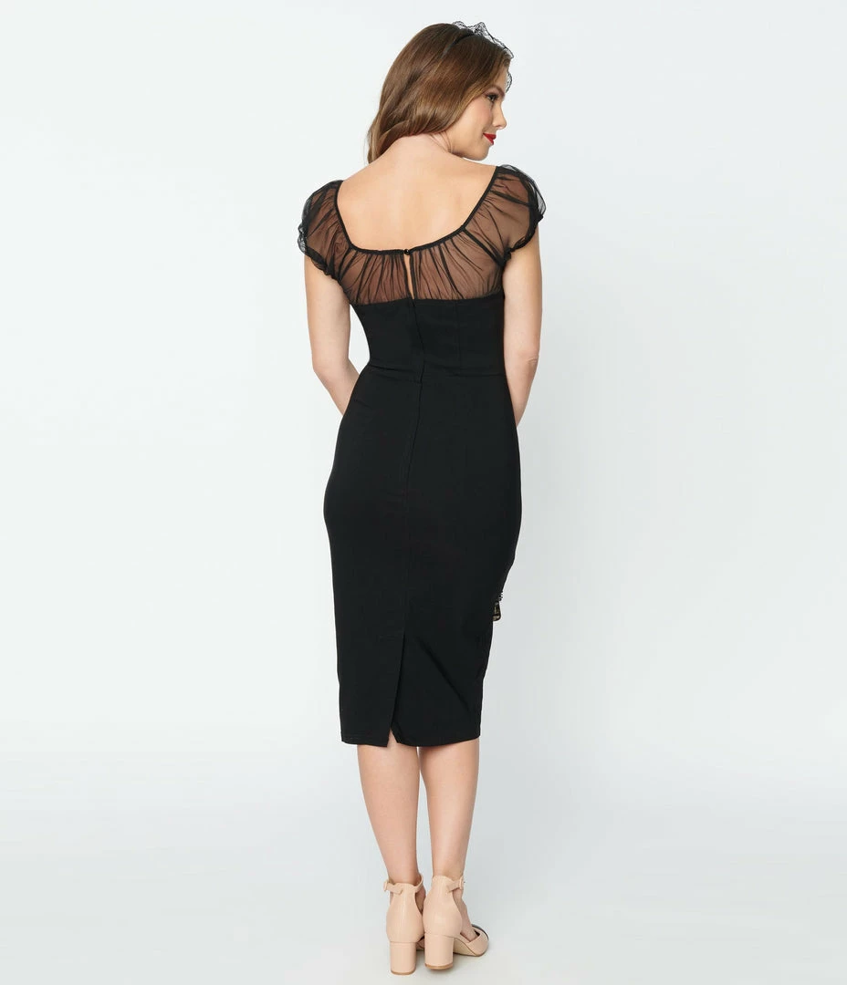This sultry pencil dress from Collectif is crafted in a black woven stretch, and boasts a glamorous black mesh illusion neckline. Complete with back zipper.