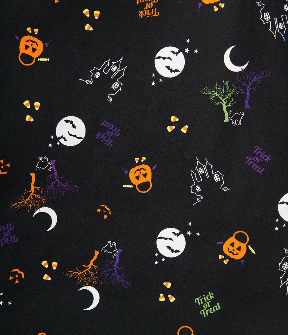This spellbinding woven frock from Collectif is crafted in cotton and boasts a frightening all hallows eve print complete with candy corn, moons, bats, haunted houses, and jack-o-lantern treat bags. The sweetheart boasts gathers and faux button accents, framed by short sleeves. While the full circle skirt boasts side pockets!