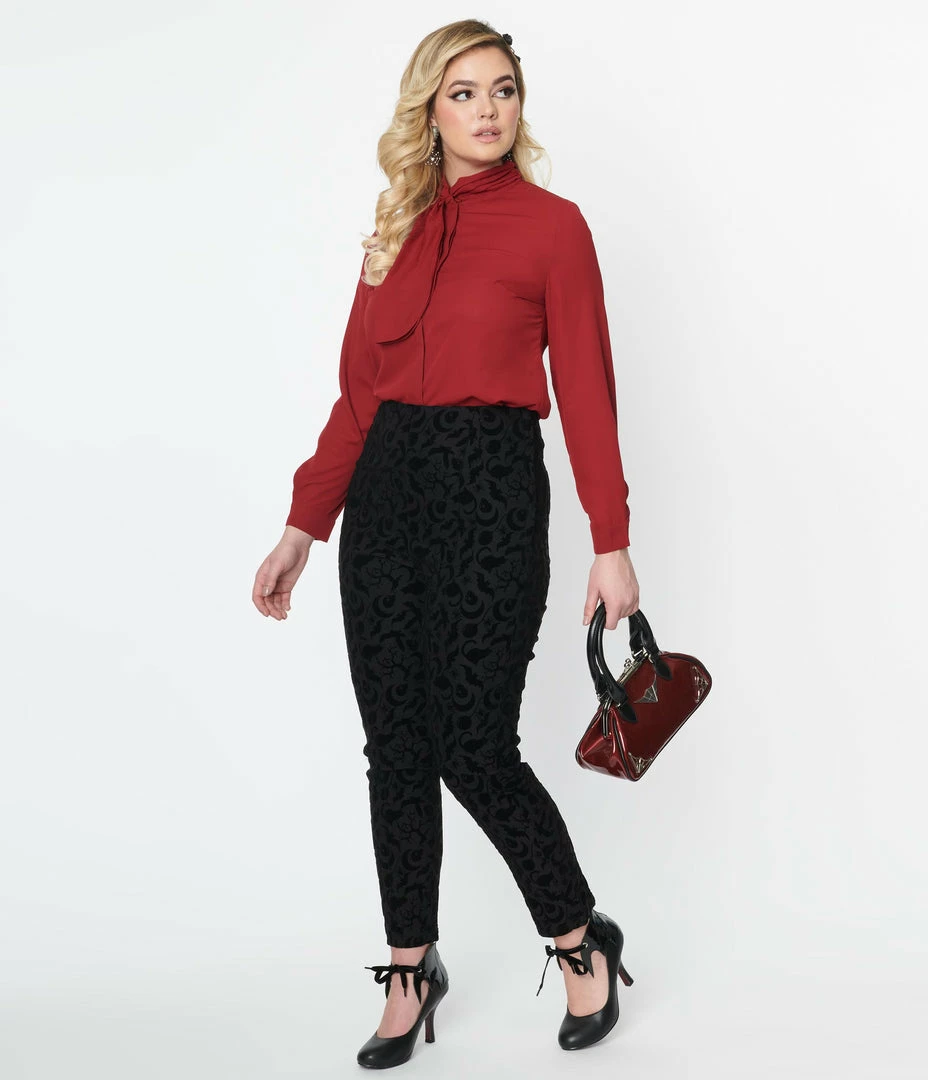These frighteningly cute pants from Collectif are crafted in a fabulous black stretch fabric that features a flocked velvet halloween design with cats, skulls, moons, crows, and spooky trees. The skinny silhouette is cinched with a side zipper!