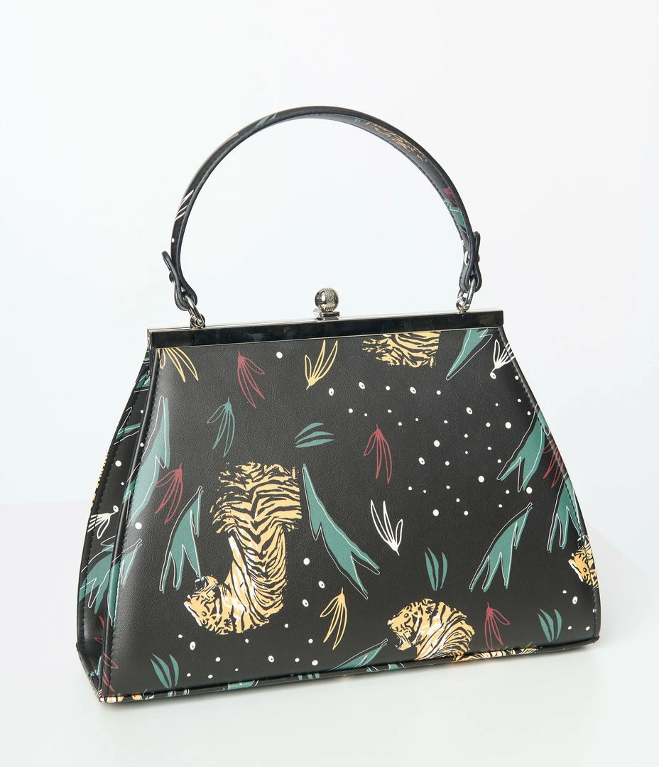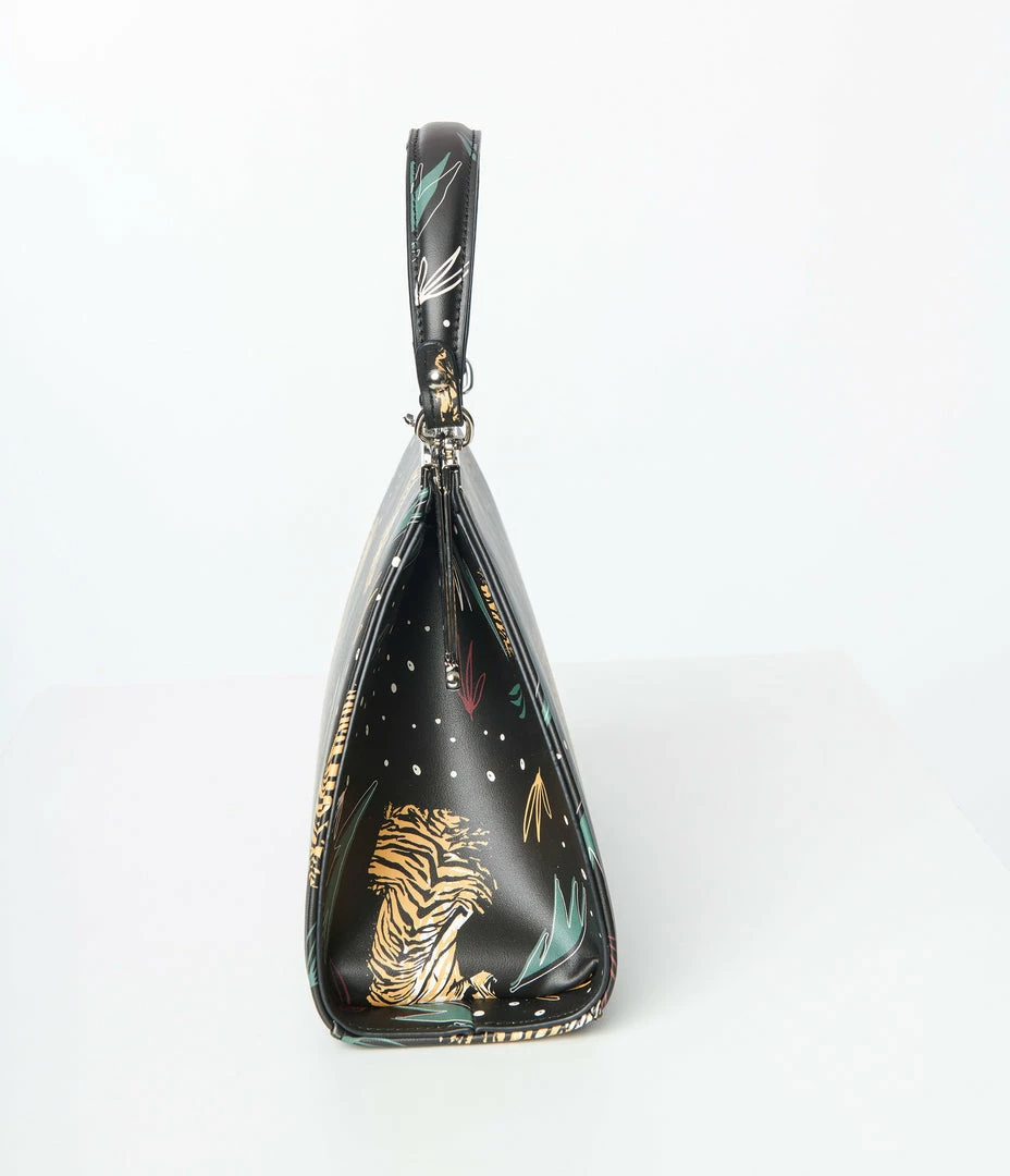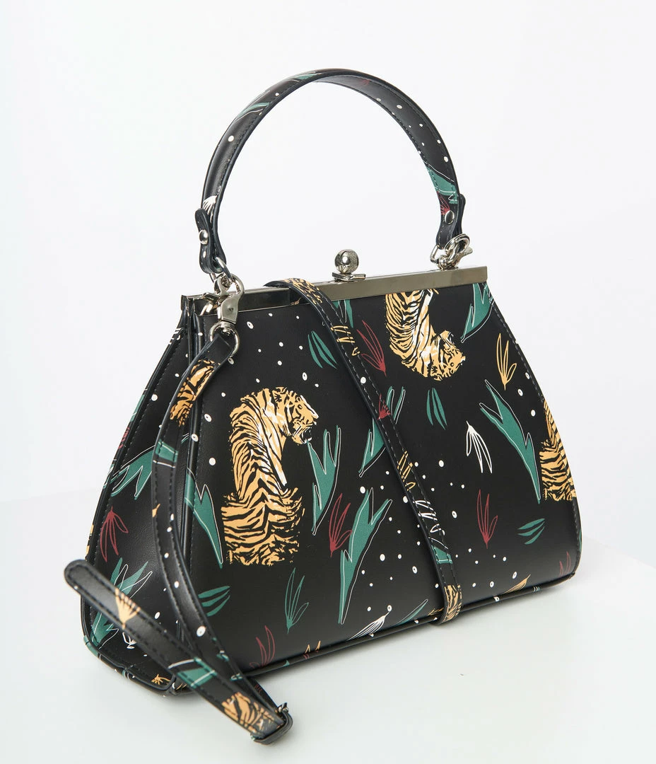 This sweet vintage style bag from Collectif is crafted in black leatherette that dances with a jungle print complete with tigers. Secured with a silver hardware ball clasp, a leatherette top handle, and a removable shoulder strap!
