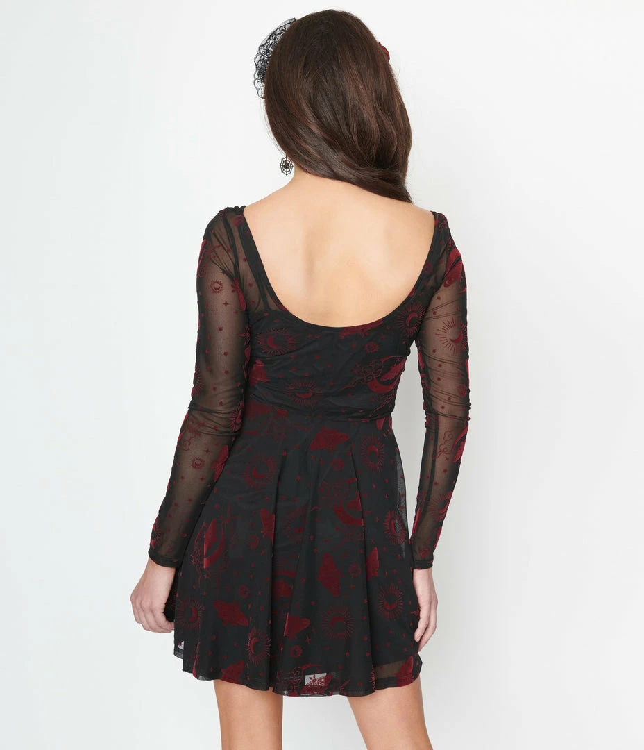 Mysterious like a moth…this marvelous black mesh skater dress dances with an enchanting moth and moonlight design crafted with a burgundy felt fabric. The scoop neckline perfectly frames the long sleeves.