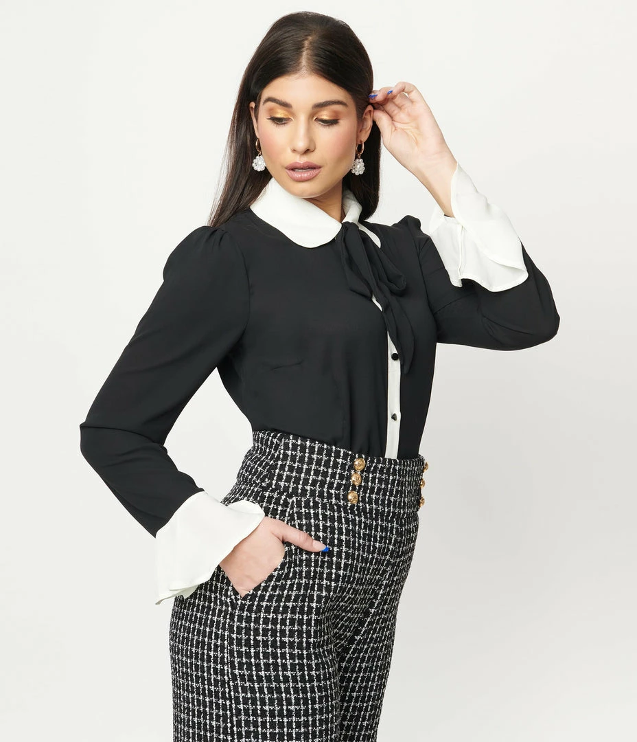 A slice of sophistication, dames! This chic and stylish blouse from Collectif is a divine pairing for your vintage attitude. The Prudence Blouse is crafted in a lightweight black crepe, centered by a button up placket that leads to a solid white Peter Pan collar, cinched with a removable self tie neck bow. Framed by long sleeves that drop into a white peplum cuff, it’s vintage elegance!