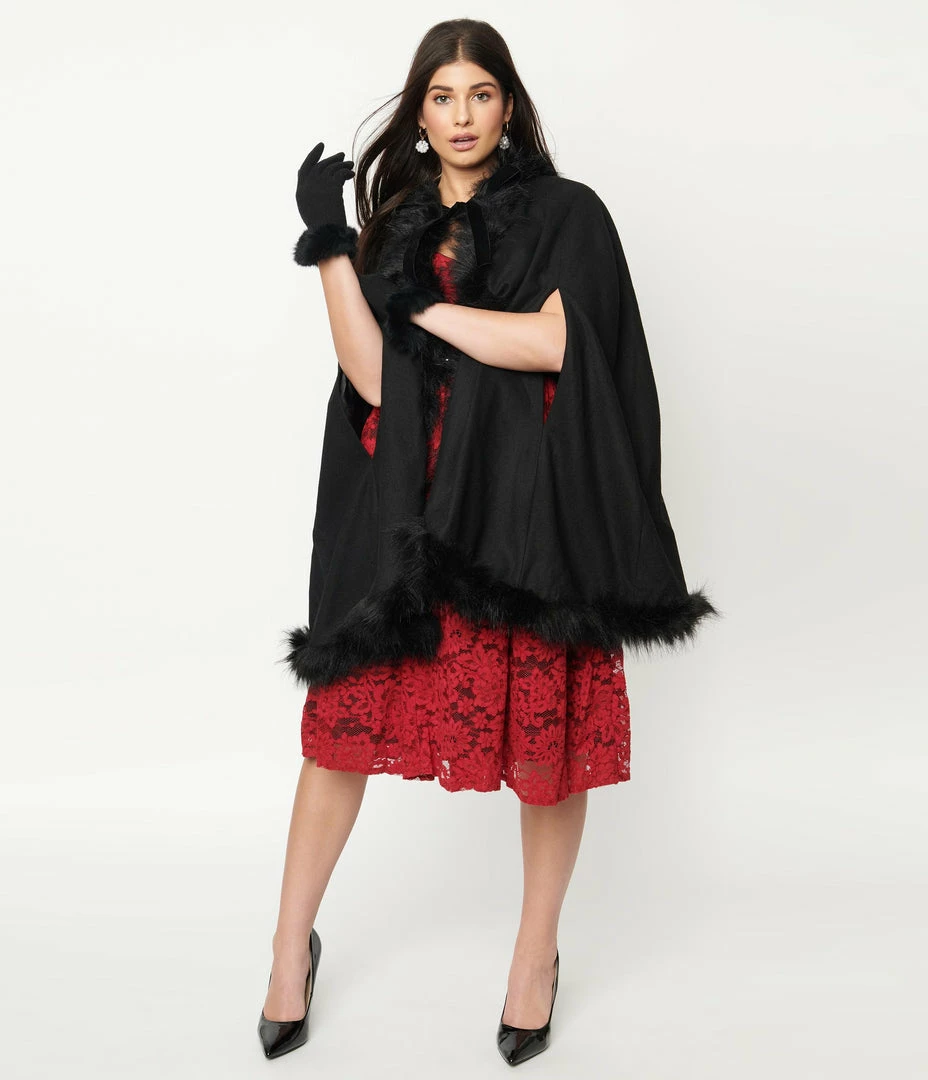 Itโs down to the divine details, darling! A retro inspired cape coat from Collectif, the Kori Coat is a warm and marvelous piece that radiates winter enchantment. Crafted in a gorgeous black wool blend and embellished with black faux fur, the smooth black lining keeps you comfortable while you sleigh away. Side slits provide easy access for your arms to grab hold of the reigns while a self tie ribbon bow can secure this cape from billowing away.ย
