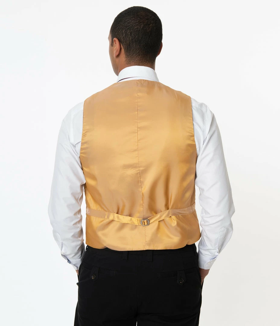 For the dapper gentleman! This dashing waistcoat from Collectif is crafted in a beautiful woven burgundy red fabric that dances with a crosshatch pattern throughout while satin-like fabric on the back keeps you comfortable. Secured with a button up front and an adjustable back strap, complete with two flap pockets!