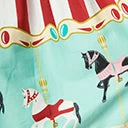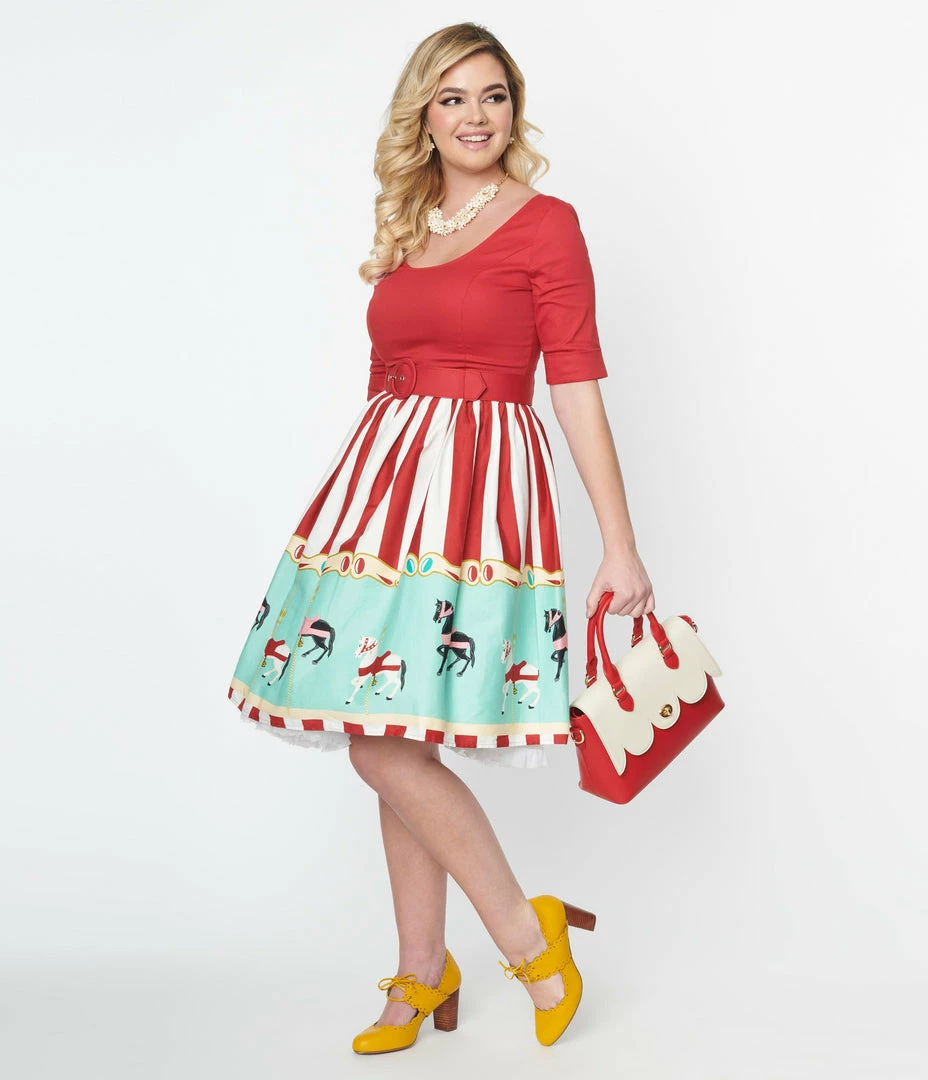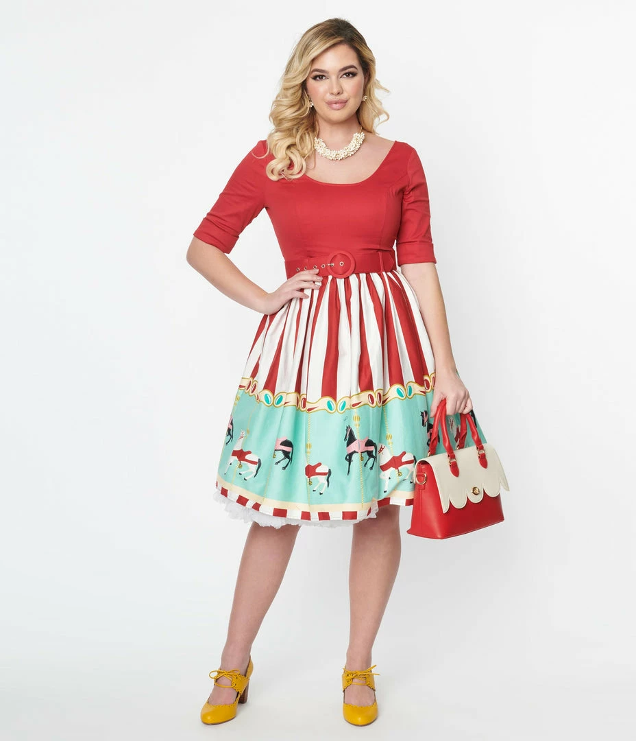 The June swing dress from Collectif is cast in a fun and bright red fabric bordered with a whimsical carousel pattern. The beautifully fitted bodice is cinched with a matching belt above the gathered waist that falls into the classic 1950s swing skirt that dances around your knees. Complete with a back zipper and hook.