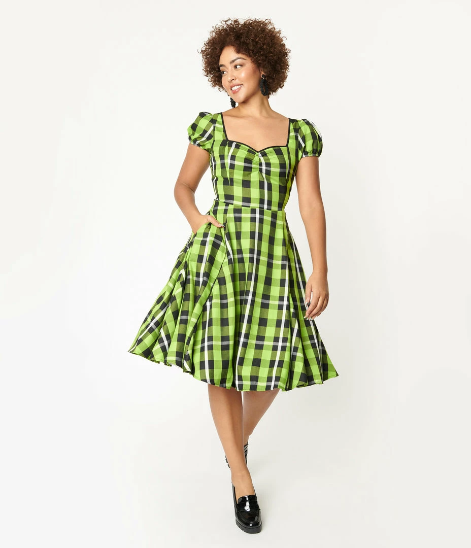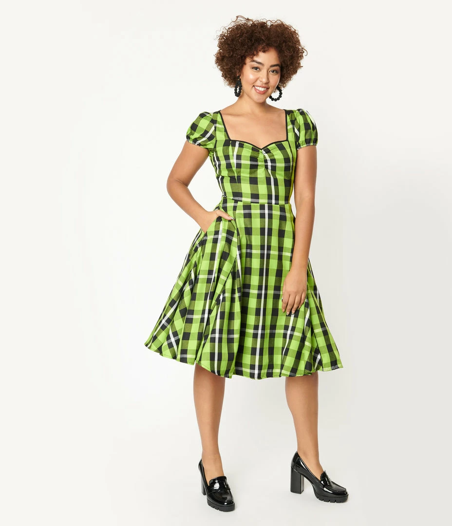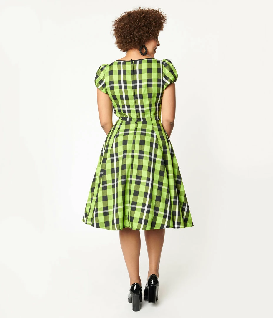 Be bold, darling! This adorable vintage inspired swing dress from Collectif is crafted in a bright green and black plaid woven fabric. The sweetheart neckline is accented with black piping and gathered at the bust, while the short puff sleeves feature elastic cuffs, adding to the retro silhouette. The seamed waist is nipped in by the back zipper, while the swing skirt drops to your knees and boasts hidden side pockets for a modern touch!