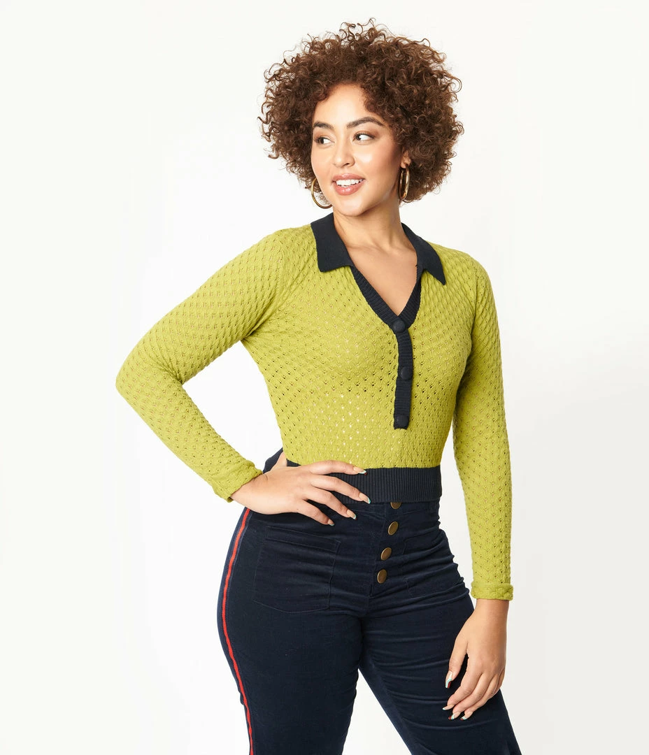 Simply divine, doll! The Lorelei top from Collectif is crafted in a retro green cotton knit fabric, boasting an all over eyelet pattern. The open collar is accented in black and centered with the black faux button up placket, while the slender long sleeves feature a fold over cuff. The black crop length hem boasts stay in place ribbing, perfect for pairing with your favorite high waist skinnies!