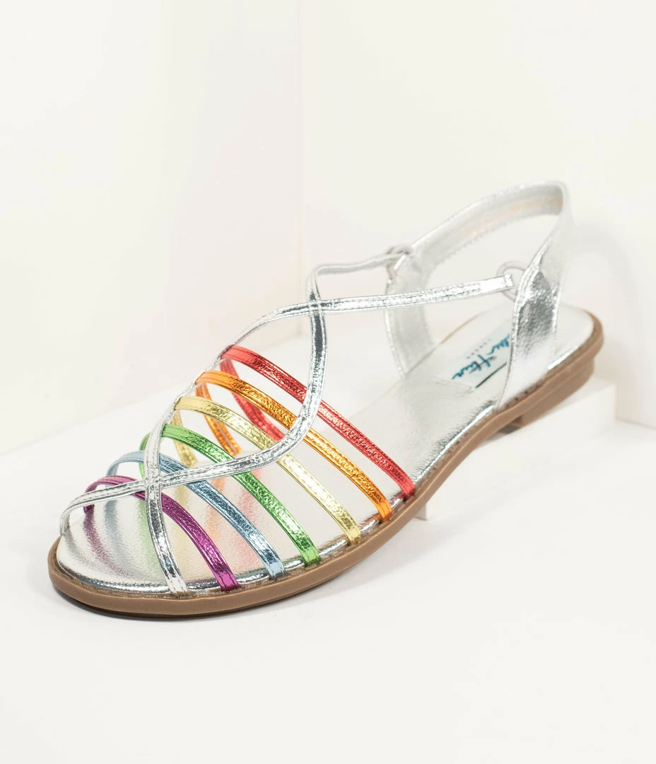 Make a splash in color! These gorgeous sandals from Lulu Hun features a fabulous slip on style that dances with silver leatherette and stunning rainbow highlights cross the vamp. The super strappy design provides a dainty peep toe while the sturdy sole keeps you comfortable!