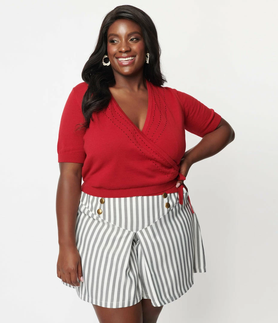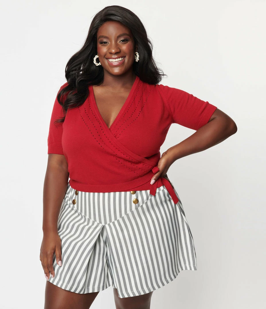 This adorable plus size cardigan from Collectif is crafted in burgundy cotton. The wrap style bodice features attached self ties, while the surplice neckline is accented with perforated stripes and framed by short sleeves.