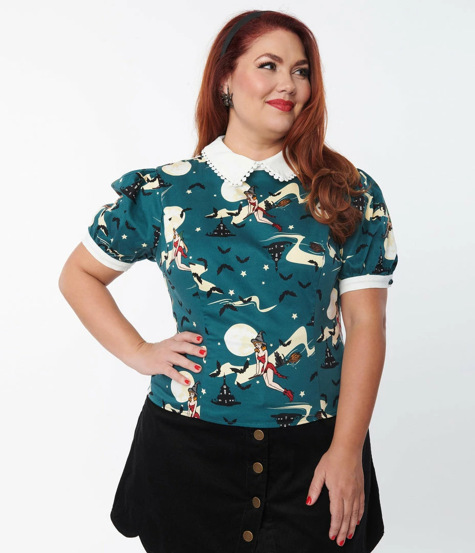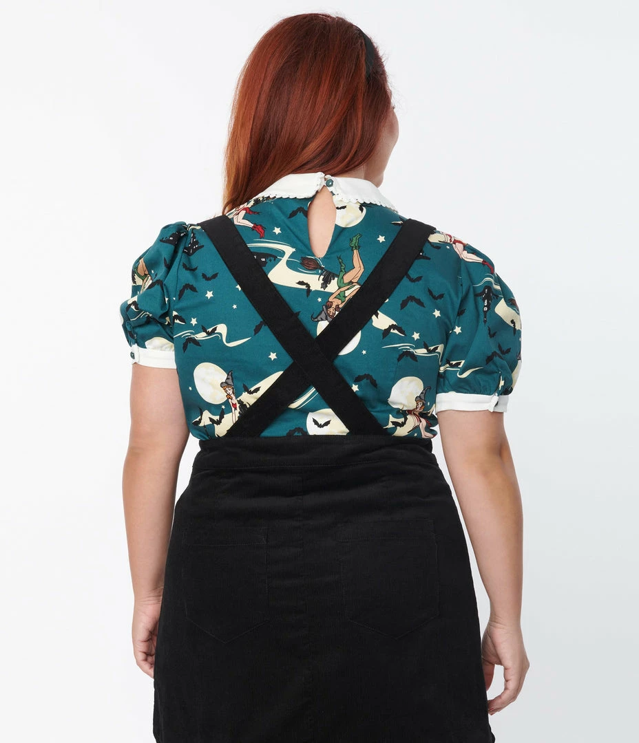 This spooky and sweet blouse from Collectif, is crafted in sturdy cotton with pinup witches flying on their brooms, throughout the green backdrop. Complete with white contrast collar and short sleeve cuffs, and side zipper!