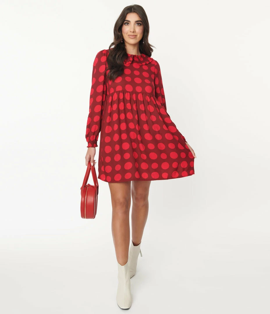 Top 10 ๐ Compania Fantastica Burgundy & Red Polka Dot Babydoll ๐ Dress ๐ฅฐ