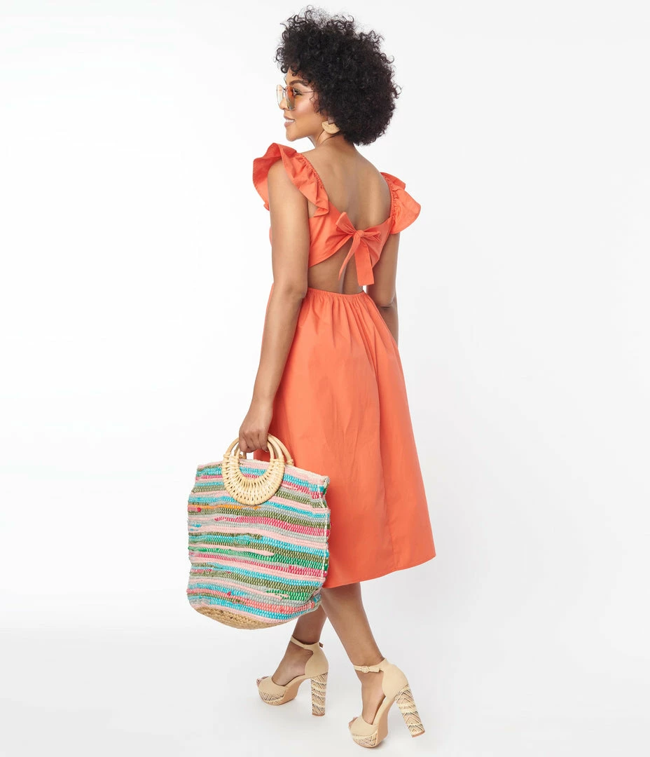 This adorable midi dress is crafted in a bright orange cotton. The square neckline is secured by the attached back ties creating a sultry keyhole back. Complete with back elastic waistband, and side pockets!