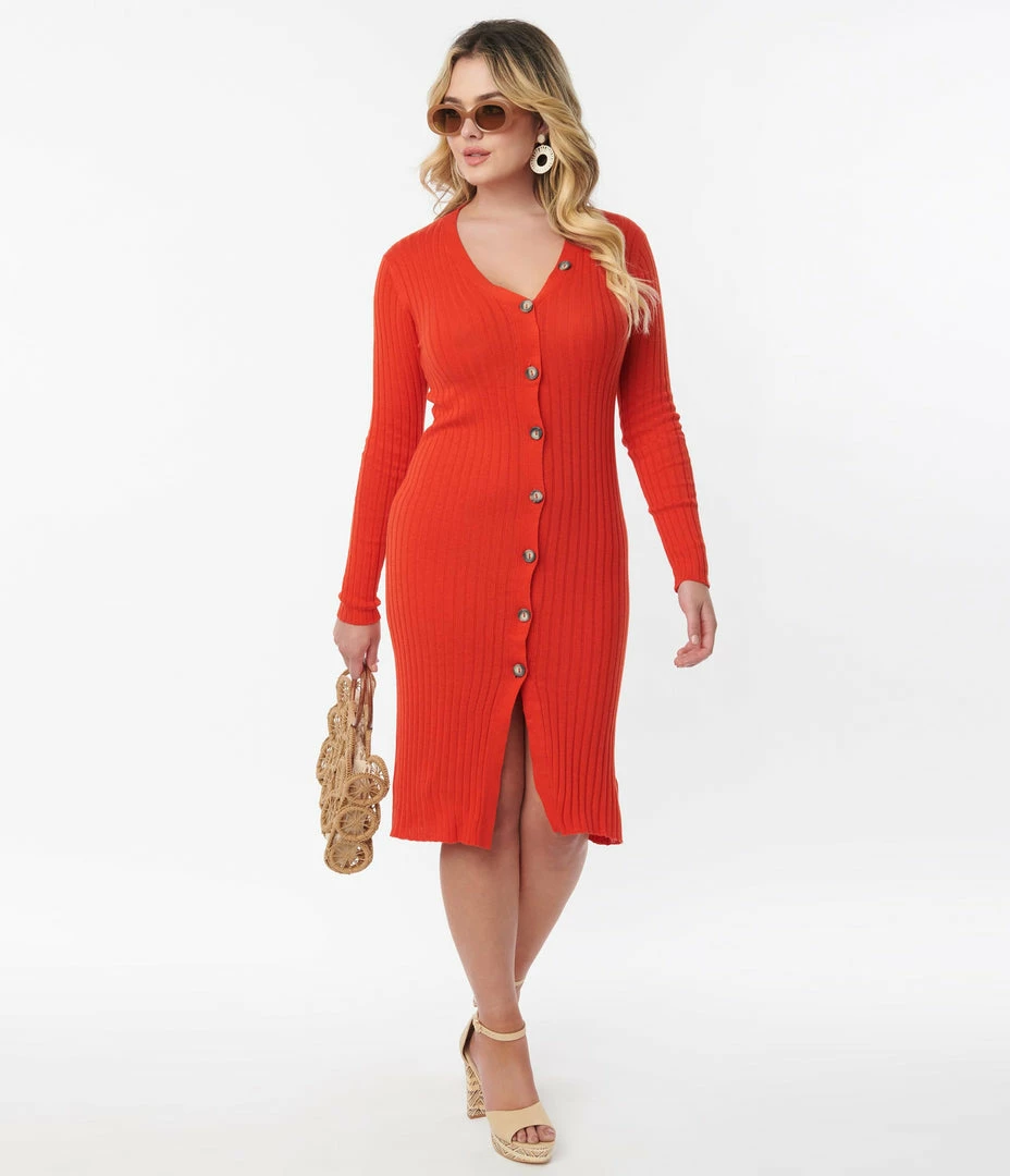 This sultry red orange dress is crafted in a ribbed sweater knit blend to hug your curves. Outfitted with a button up front , and long sleeves!