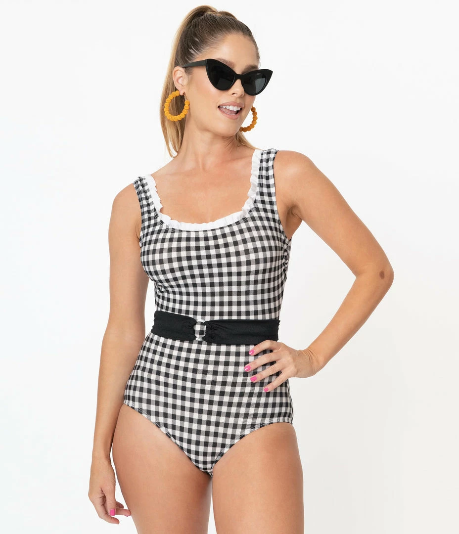 Some stunning swimwear is surfacing, darlings! Capture the scene in such a captivating vintage inspired black and white gingham swimsuit from Esther Williams. Luxuriously front lined in flattering mesh with bust enhancing bra shelf and sewn in padding, the sultry scoop neckline is embellished with a white ruffle accent. A black faux belt highlights your pin-up figure for poolside flaunting!