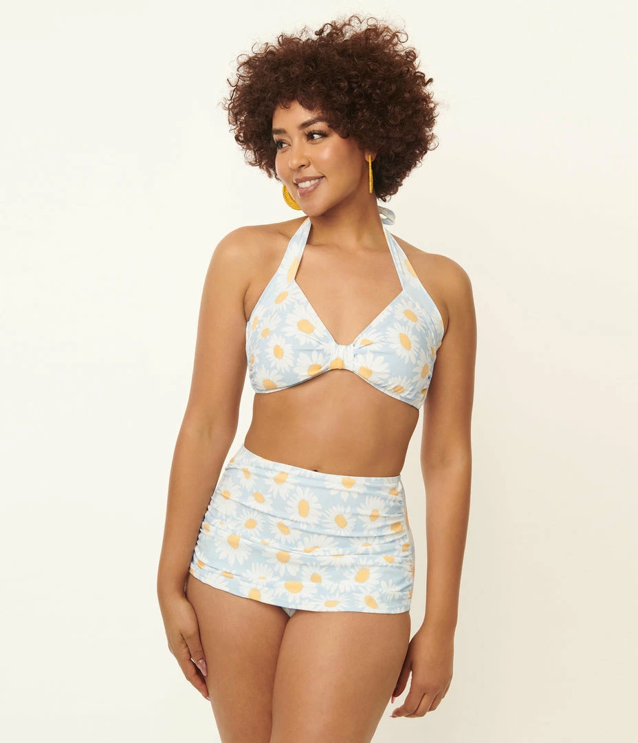 This fabulous swim set features white and yellow daisies printed throughout the light blue backdrop of this two piece bikini set. The sultry bikini swim top is secured with a hook back and a self tie halter and outfitted with sewn in padding and boning while the swim briefs features a front skirt and high waist.