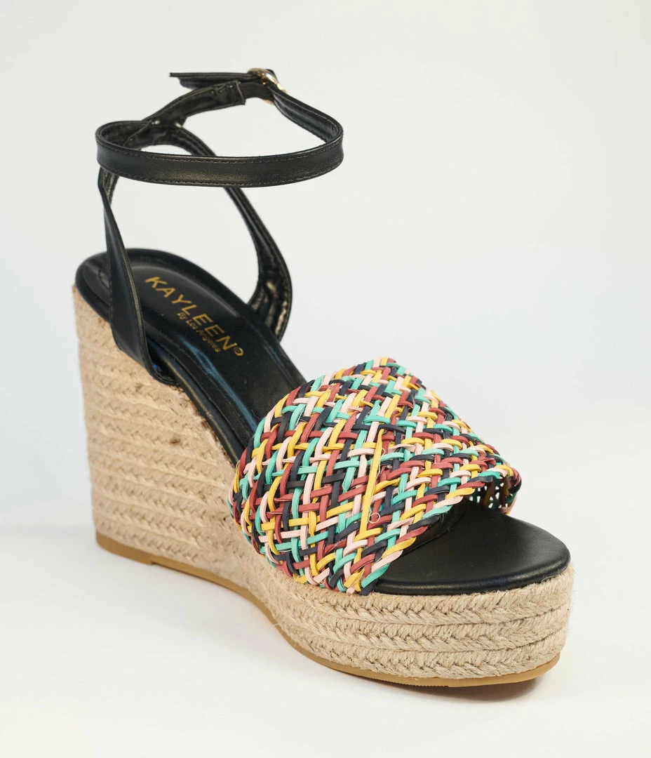 Summon some sunshine in these delightful pair of wedges, boasting a woven leatherette vamp in a beautiful rainbow array. The dramatic 1.5 inch platform and 5 inch wedge heel is embellished with woven espadrille while the black leatherette ankle strap secures these kicks, outfitted with a cushion insole!