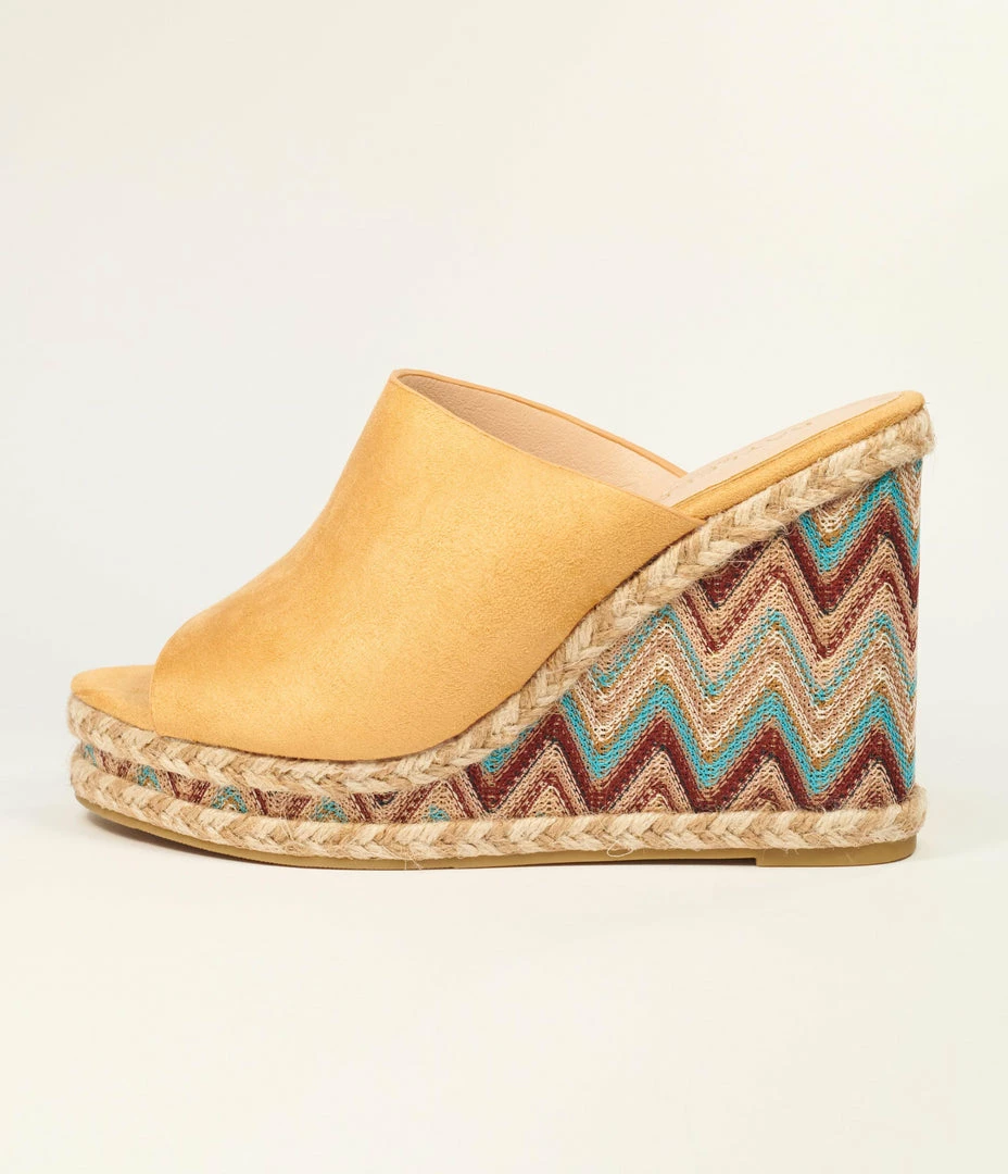 Retro perfection! This adorable pair of heels is crafted with a tan faux suede peep toe vamp while the 1 inch platform and dramatic 4 inch wedge heel are embellished with stunning multicolor chevron stripes and framed with a gorgeous braided espadrille accent. A soft cushion insole makes it easy to wear all day and into the night.