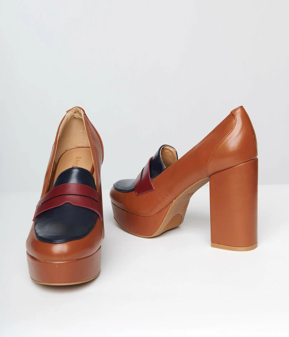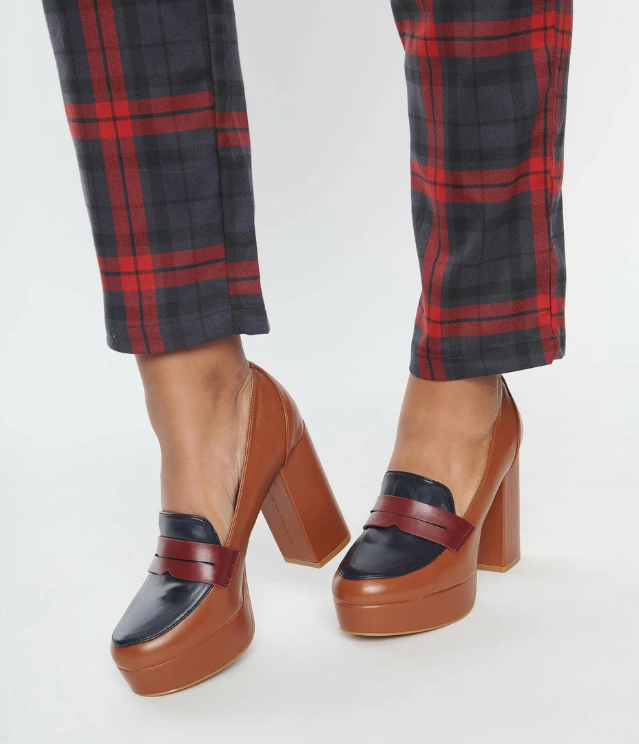 Dashing and Dapper is the way to go. Feel cool and confident parading in these loafer heels. Beautifully crafted brown patent leatherette with a touch of navy and burgundy. The retro 2.5 inch block heel lends a stable stroll to your stride.