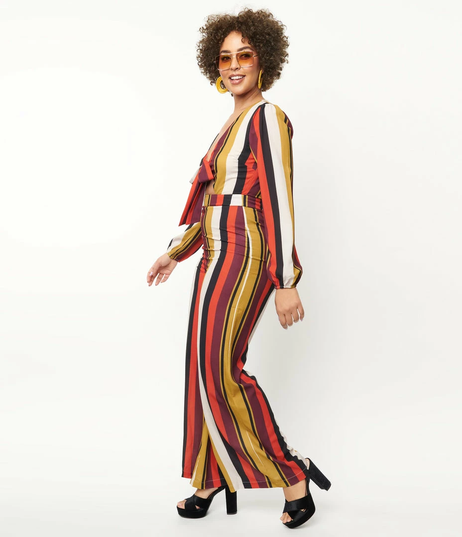 Make โem dizzy, darling! An eye-catching jumpsuit for a rockabilly BBQ, this fabulous silhouette is crafted in a textured crepe and boasts a stirring pattern of red, wine, white, mustard, and black stripes throughout. The sultry bodice features front self ties for retro stylings, framed by long sleeves that drop into elastic cuffs. The banded waist is cinched with a back zipper while the wide legs drop to your ankles!