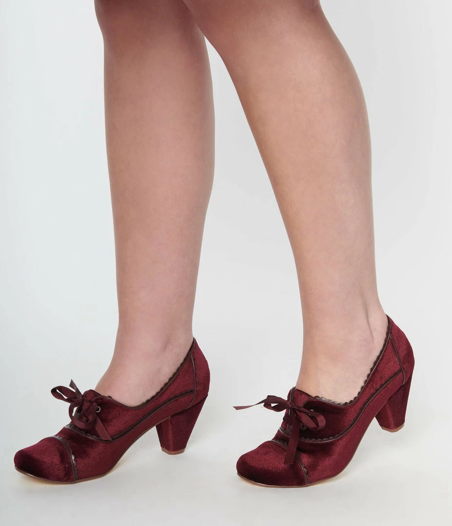 Put a little hop in your step, gals! These pin-up perfect pair of pumps from Chelsea Crew are crafted in a marvelous burgundy red velvet and boast a dramatic 3 inch lift. The Oxford styling is embellished with scalloped highlights and a classic lace up vamp with matching ribbon while the leather insole keeps you dancing through the night!