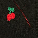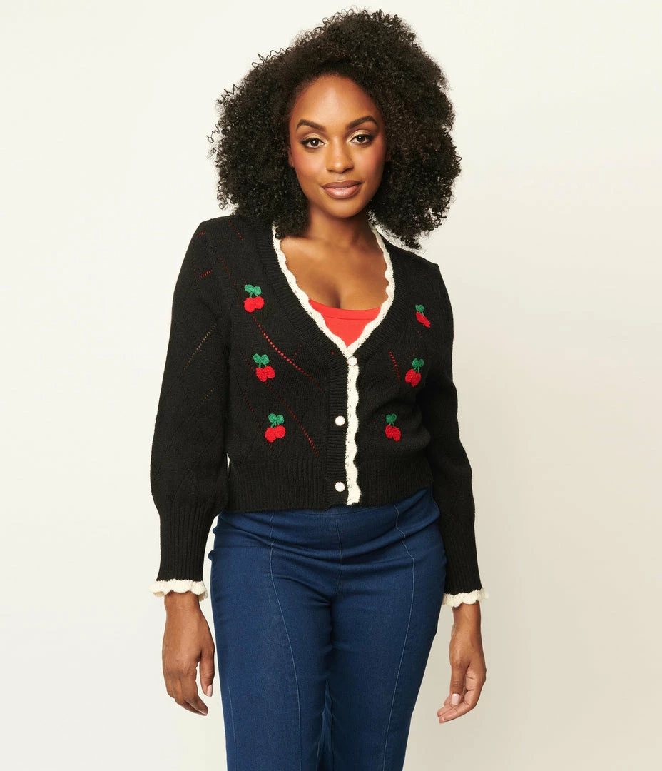 Top it off with a cherry, gals! A warm piece for chilly breezes, this black cardigan in crafted in a perforated knit with a diamond pattern and embellished with red cherries. The button up front leads to a V-neckline and is framed by long sleeves while ivory knit highlights the front and cuffs!