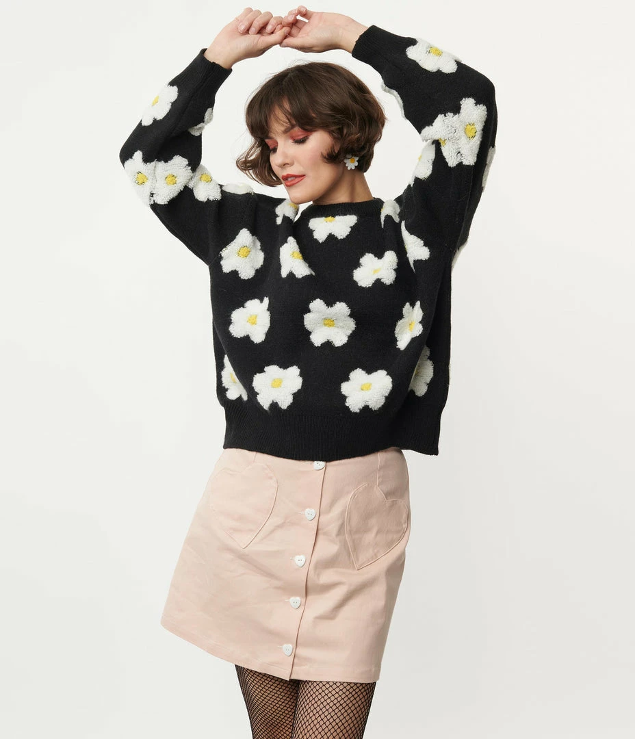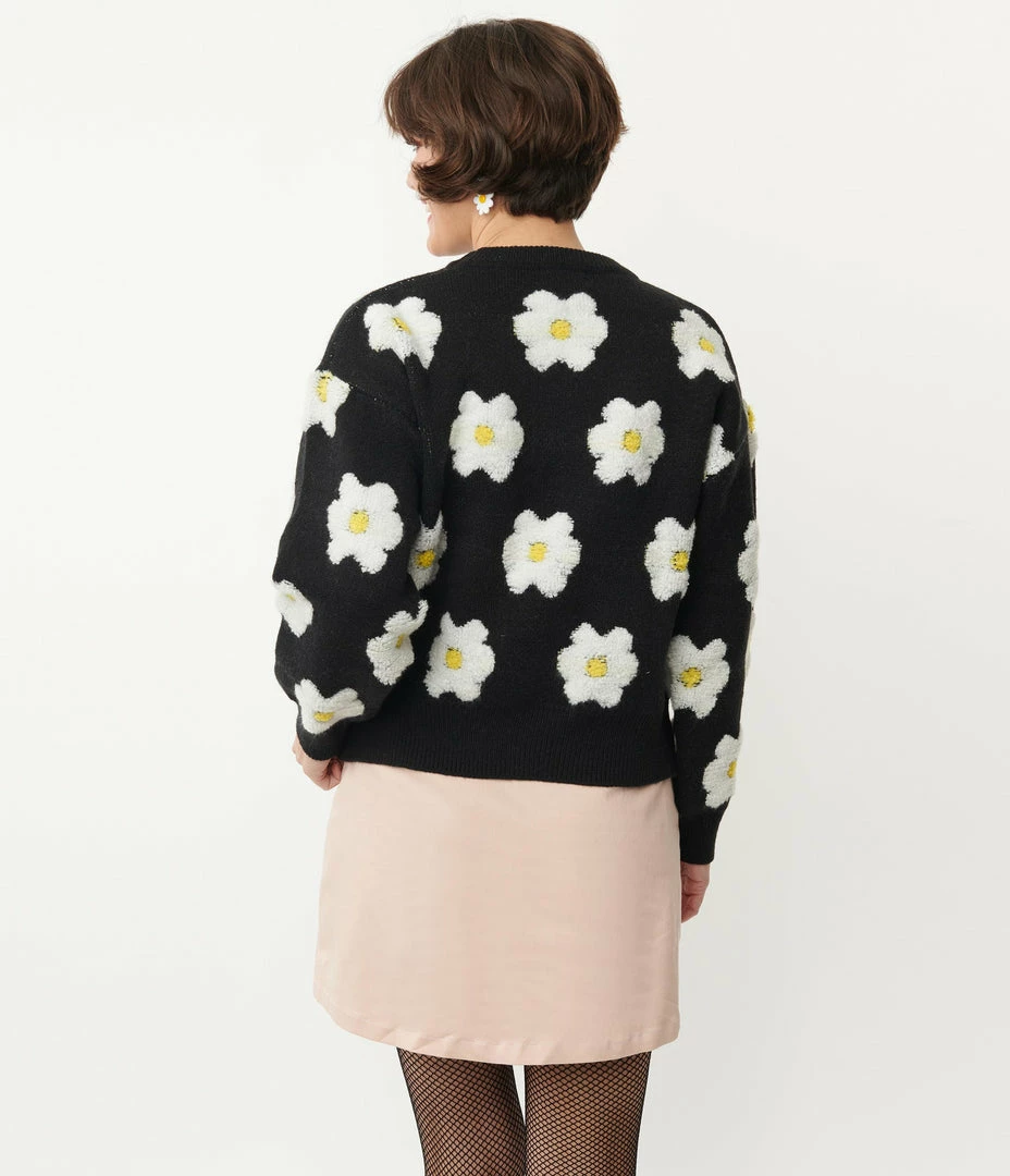 Cozy in florals, dolls! This sweet sweater features a charming pattern of white fuzzy daisies with yellow centers cascade throughout the black backdrop. Crafted in a soft knit fabric that features a modest scoop neckline, framed by casual long sleeves, and a comfortable oversized design for a charming vintage accent!