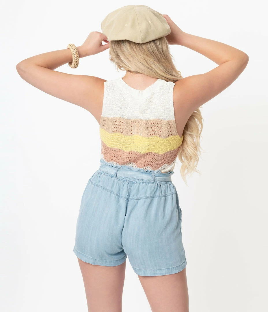 All aboard for spring, darling! These fabulous chambray shorts are crafted in a woven fabric that features a marvelous retro paperbag elastic waist, and a self tie matching sash. The flirtatious shorts are outfitted with side pockets for lovely function!